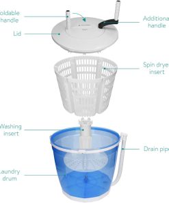 - UTILISATION : Insérez le tambour dans la machine, remplissez d’eau, ajoutez du détergent et faites tourner le linge avec la poignée. Videz l’eau, insérez la centrifugeuse et répétez le processus pour l’essorage.