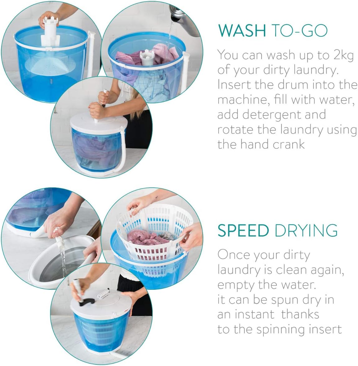 - ÉCO-RESPONSABLE : Ce mini lave-linge compact est non électrique et s’actionne entièrement à la main. Non seulement vous nettoyez votre linge, mais vous faites un geste pour l’environnement.
