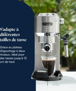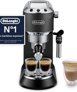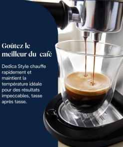 Description du produit La machine à expresso à levier traditionnelle Dedica EC 685.M de De’Longhi, avec une largeur de seulement 15 cm, présente un design extrêmement compact, transformant ainsi même la plus petite cuisine en un bar à café italien et vous transformant en barista. Grâce à son contrôle électronique de la température, à sa quantité de remplissage des tasses programmable individuellement et à sa mise en service rapide, la Dedica Style offre toujours des résultats parfaits pour préparer un délicieux espresso ou café. Avec sa buse professionnelle pour mousser le lait et sa surface d’appui pour les tasses réglable en hauteur, vous pouvez également préparer à la maison des cappuccinos, des lattes macchiatos et d’autres spécialités de café au lait dans de grands verres. La machine est prête à l’emploi en 40 secondes. Le porte-filtre convient pour 1 ou 2 tasses ainsi que pour les dosettes de café. Le filtre est amovible. Les couleurs modernes avec un fini mat tendance et le logo Dedica en relief soulignent le design unique de la Dedica.De’Longhi – Meilleur chaque jour.Les innovations de De’Longhi, la qualité exceptionnelle et le design distinctif rendent les tâches quotidiennes spéciales. Nous développons des produits qui se distinguent par leurs performances, leur fonctionnalité, mais surtout par le plaisir d’utilisation. Notre objectif est de proposer quelque chose de spécial avec tous nos produits, techniques et approches. Nous concevons des produits fonctionnels avec des formes élégantes et épurées, des combinaisons de couleurs innovantes et des matériaux de haute qualité, adaptés aux besoins individuels des foyers du monde entier.Contenu de la livraisonMachine à expresso De’Longhi Dedica Style EC 685.BK, noire Contenu du coffret Machine Expresso