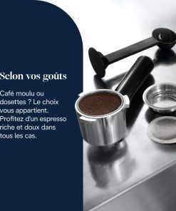 Machine compacte et bien conçue, elle prépare des expressos au goût riche et offre une belle mousse grâce à sa buse à lait; le réservoir d’1 L et le boîtier en métal donnent une impression de solidité, l’utilisation et le nettoyage sont simples, et la compatibilité avec les dosettes E.S.E ajoute de la praticité.