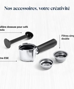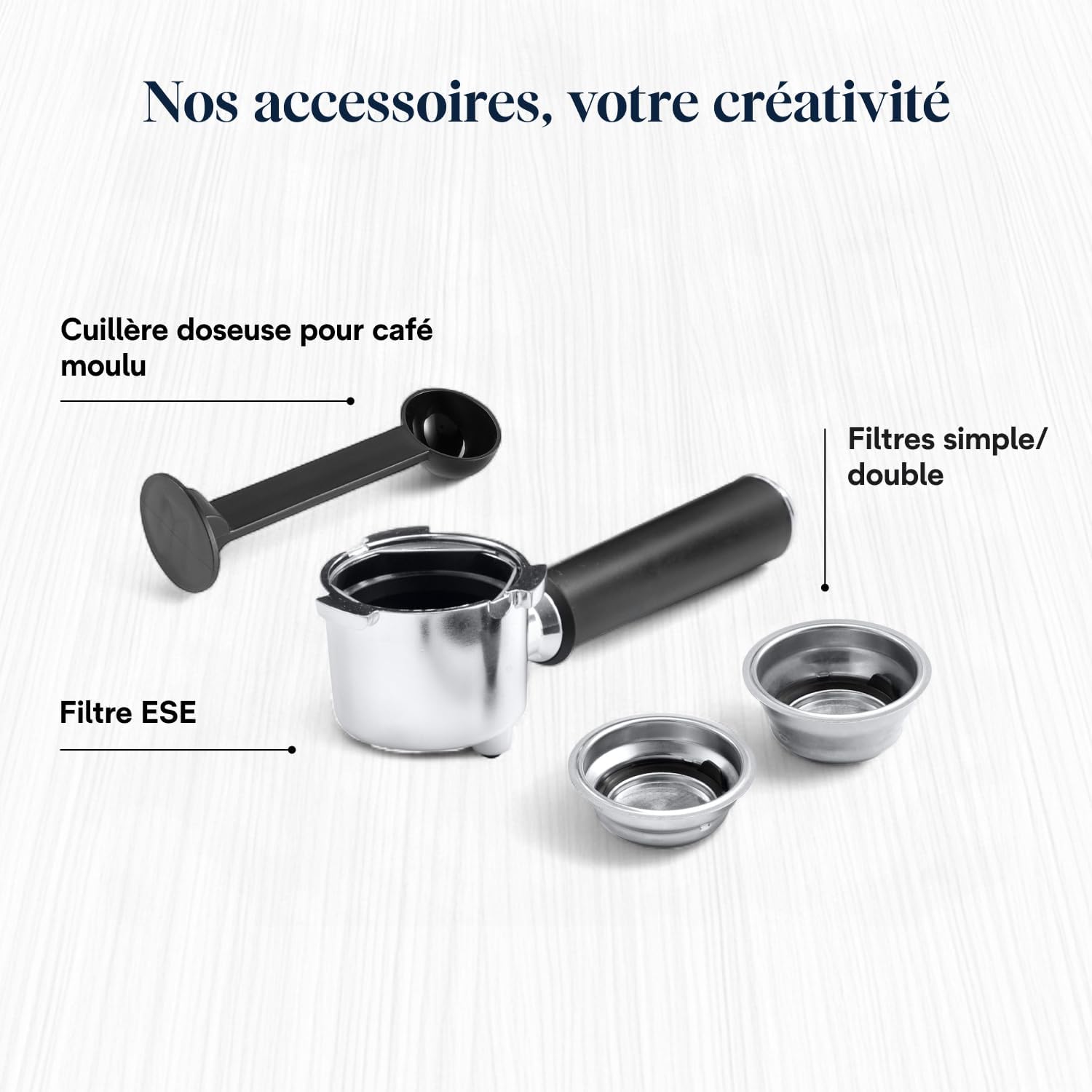 - SUPPORT DE PORTE-FILTRE FLEXIBLE : Avec des inserts pour 1 ou 2 tasses ainsi que pour les dosettes de café ESE – le filtre est amovible