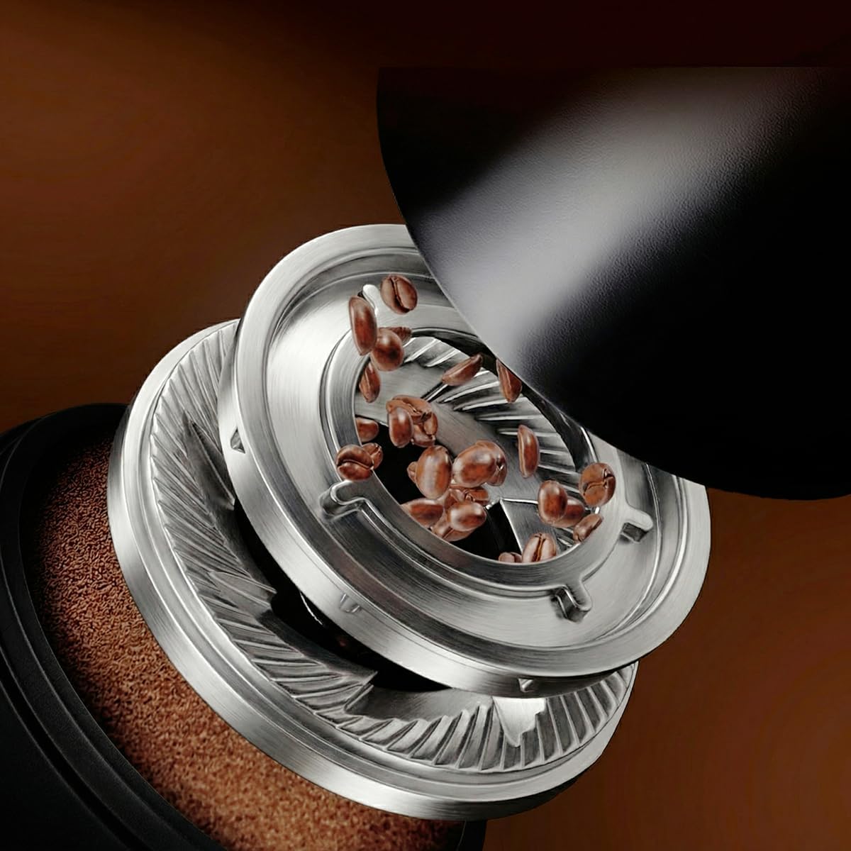 - Conçue pour s'adapter à tous vos besoins, elle dispose d'un réservoir d'eau de 1,1 l, d'une capacité de 110 g de grains de café, et de la possibilité de régler entre 5 niveaux de mouture. De plus, ses lames en acier inoxydable assurent un broyage uniforme et durable, tandis que la fonction de détartrage facilite l'entretien, garantissant des performances optimales dans le temps.