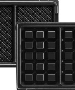 Pour réaliser des gaufres gourmandes qui se tartinent sans effort ! – Thermostat de sécurité et voyant de contrôle – Multifonction- 2 gaufres tartinables 155 x 100 mm ou 2 croque-monsieur ou 6 mini gaufres tartinables 99 x 100 mm en simultané – Louche doseuse en polypropylène – Système de fixation des plaques par clips – Plaques en fonte d’aluminium revêtues d’antiadhésif – Capots et poignées en bakélite – Base en polypropylène – Tartineur blanc en polypropylène – Procédé breveté – Livre de 20 recettes – Couleur : Noir