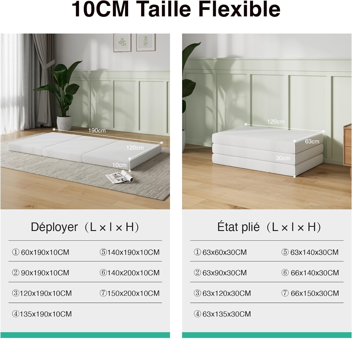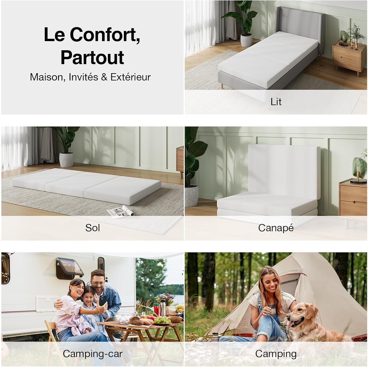 - 💙 【CONFORT PARTOUT】Ce matelas pliable épouse les courbes du corps et vous aide à vous détendre pleinement. Il se transforme facilement en lit d’appoint, coussin de sol ou petit canapé selon vos besoins. Idéal à la maison, en déplacement ou en camping pour un repos confortable où que vous soyez.