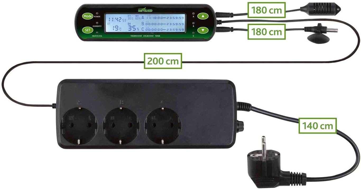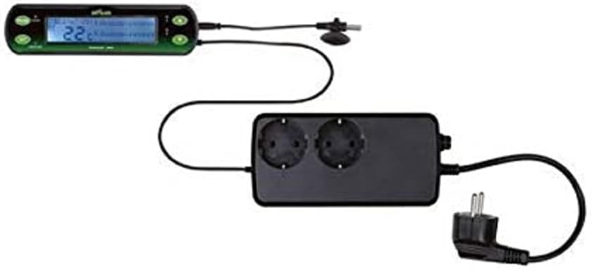 Trixie Thermostat / hygrostat numérique avec trois circuits pour un fonctionnement diurne et nocturne. Avec deux connexions à température contrôlée ainsi qu’une connexion avec minuterie. Permet le contrôle de la température de deux sources de chaleur pour le fonctionnement de jour ou de nuit ainsi qu’une source de chaleur chacune pour le fonctionnement de jour et de nuit. Idéal pour une utilisation avec des lampes chauffantes, des tapis chauffants et d’autres sources de chaleur afin d’éviter la surchauffe ou l’hypothermie. Plage de 0 °C à 50 °C. Délai de commutation sélectionnable de 1 °C à 15 °C. Plage de contrôle de l’humidité de 20 à 90 %. Il peut être utilisé pour le chauffage et le refroidissement. Longueur du câble du capteur : 2 x 180 cm. Avec fonction d’alarme visuelle, capacité de commutation maximale 3 x 400 W. La batterie empêche la perte de données en cas de panne de courant.