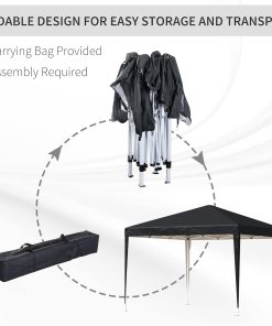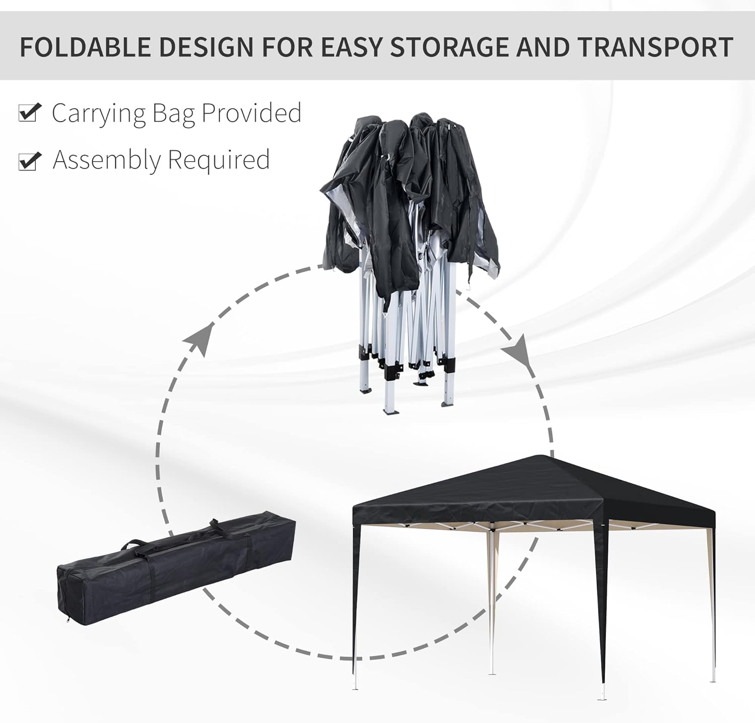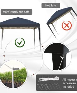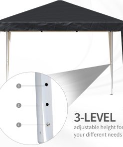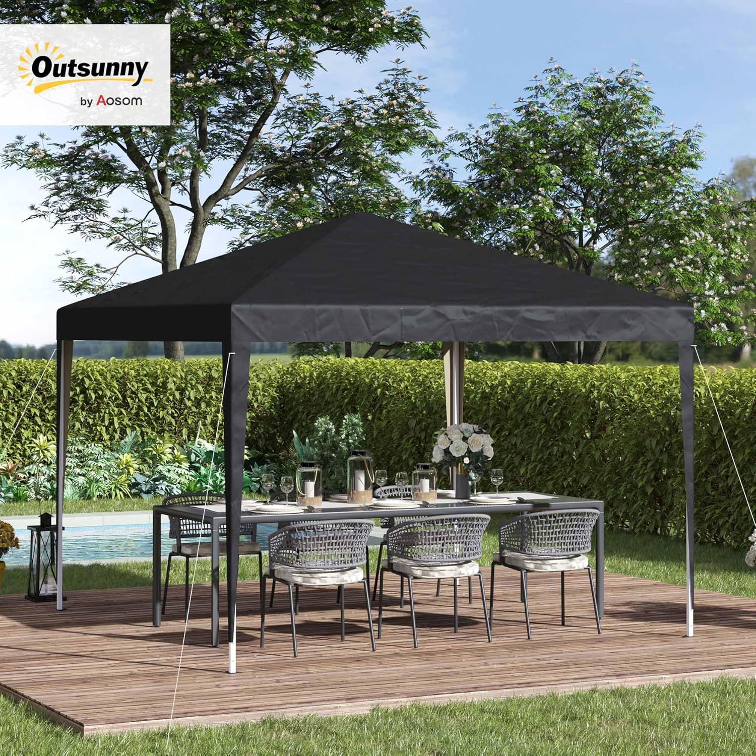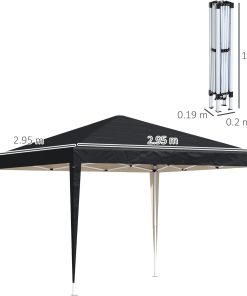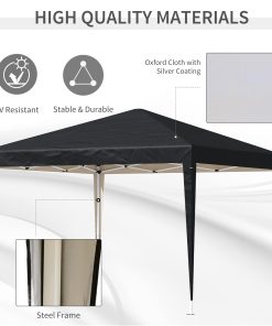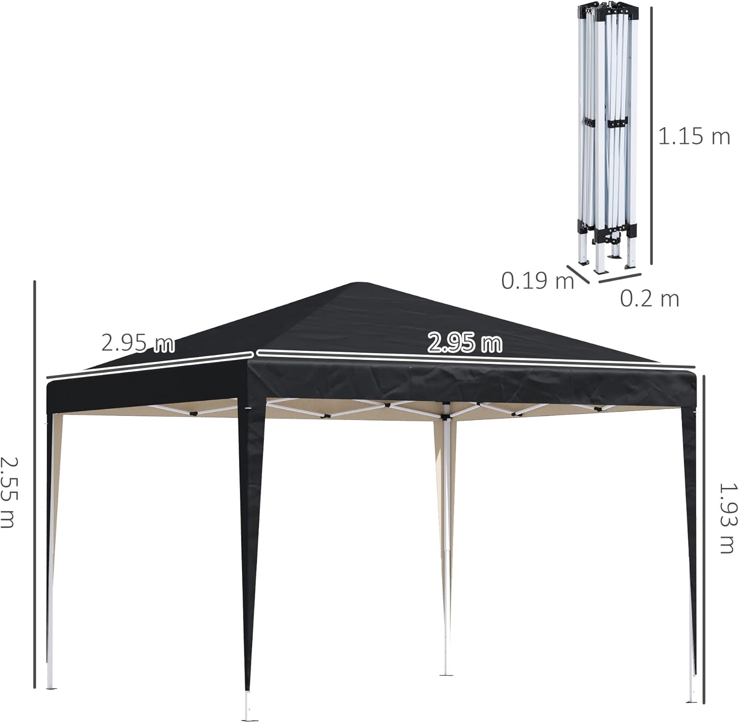 Bought this last minute for a garden party; the black with silver lining looked great and stayed waterproof through several downpours. It needed a few of us to erect in the wind because the canopy kept blowing while stretching it across the corners, but it came down easily the next day and packed away in the handy storage bag.