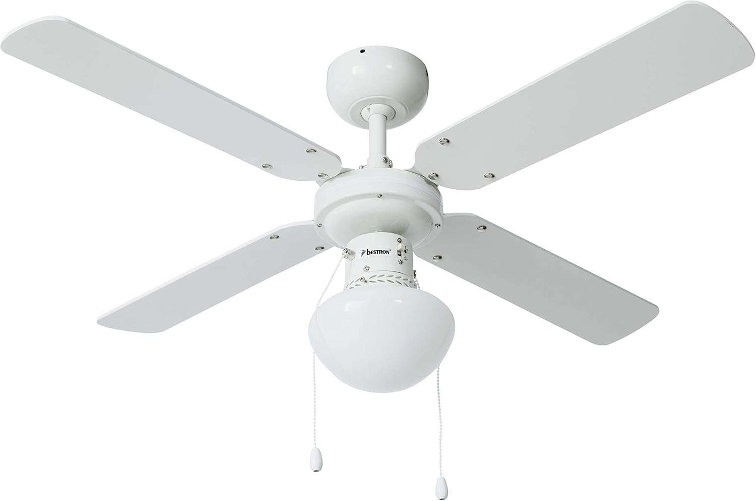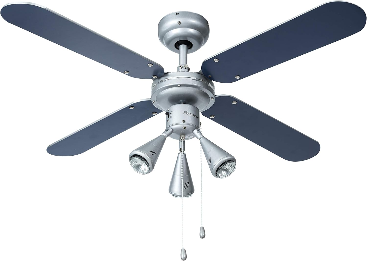 Ventilateur de plafond silencieux (max. 43,50 db (A)) pour apporter une agréable sensation de fraîcheur dans le salon ou le bureau-3 niveaux de vitesse sélectionnables au moyen de l’interrupteur à tirette, Débit d’air indirect/direct ajustable sur l’appareil, Idéal pour une utilisation tout au long de l’année et un fonctionnement en continu-3 spots lumineux avec interrupteur à tirette pour éclairer même sans ventiler, 4 pales bicolores réversibles combinables avec tous les styles d’ameublement-Installation facile de l’appareil (4,01 kg), Plaque de montage incluse, Hauteur d’installation de 2,30 minimum, Puissant moteur à bobine en cuivre-Contenu de la livraison : 1 Bestron Ventilateur de plafond avec 3 lampes LED GU10 (A+) incluses, Puissance : 50 W, Ø 102 cm, Matériau : Bois/Métal, Couleur : Argent/Bleu, DLHB42S