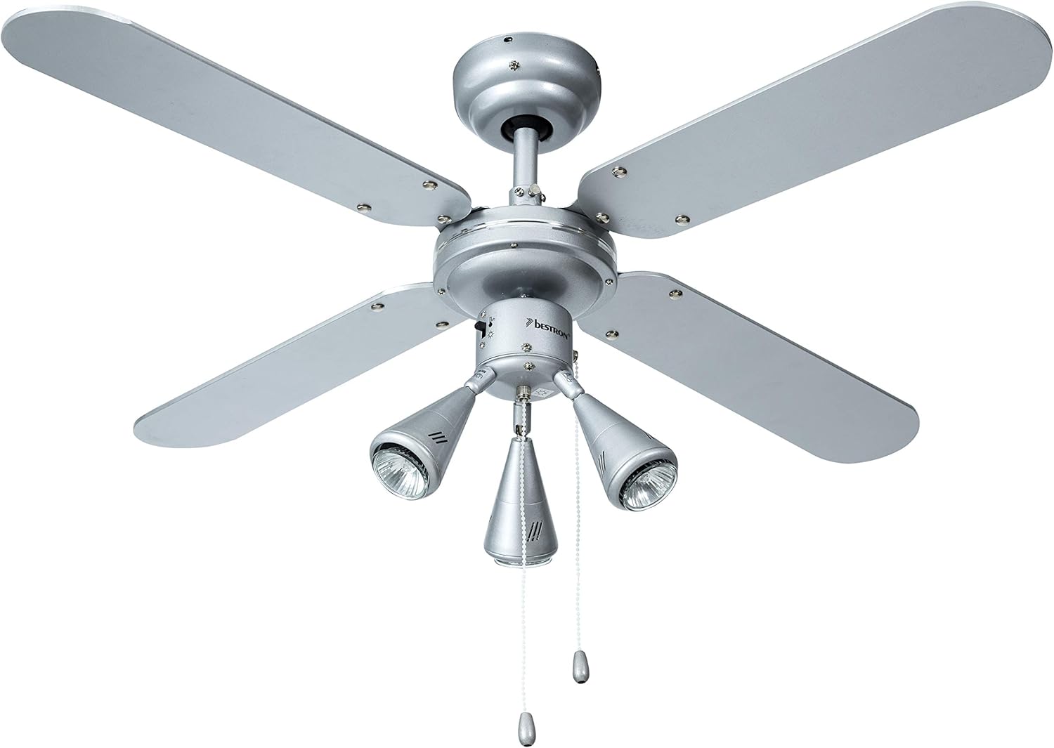 - Contenu de la livraison : 1 Bestron Ventilateur de plafond avec 3 lampes LED GU10 (A+) incluses, Puissance : 50 W, Ø 102 cm, Matériau : Bois/Métal, Couleur : Argent/Bleu, DLHB42S