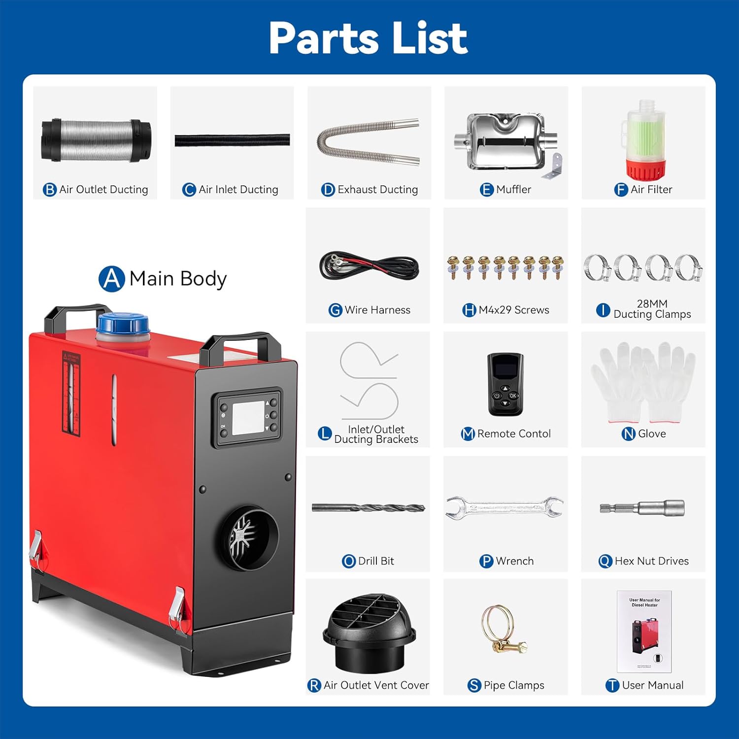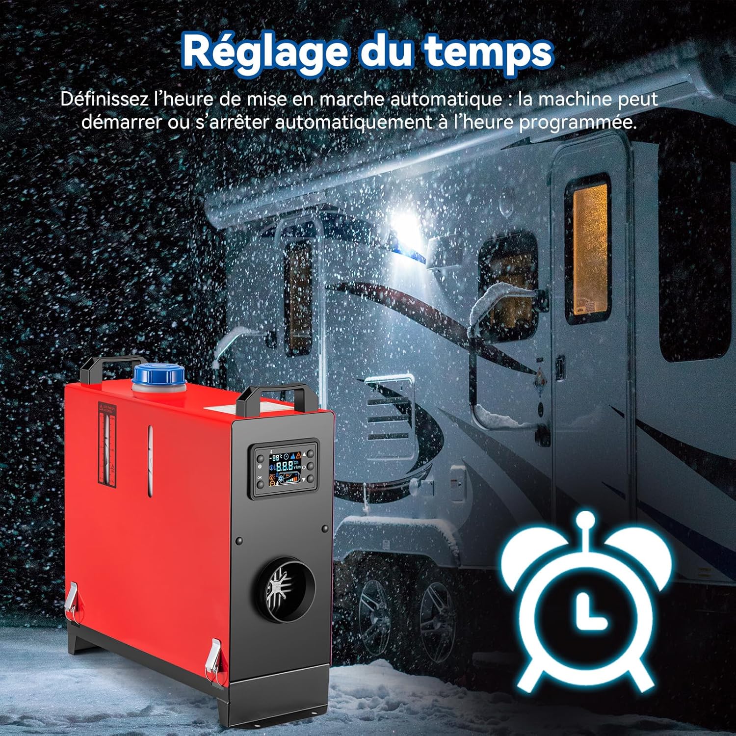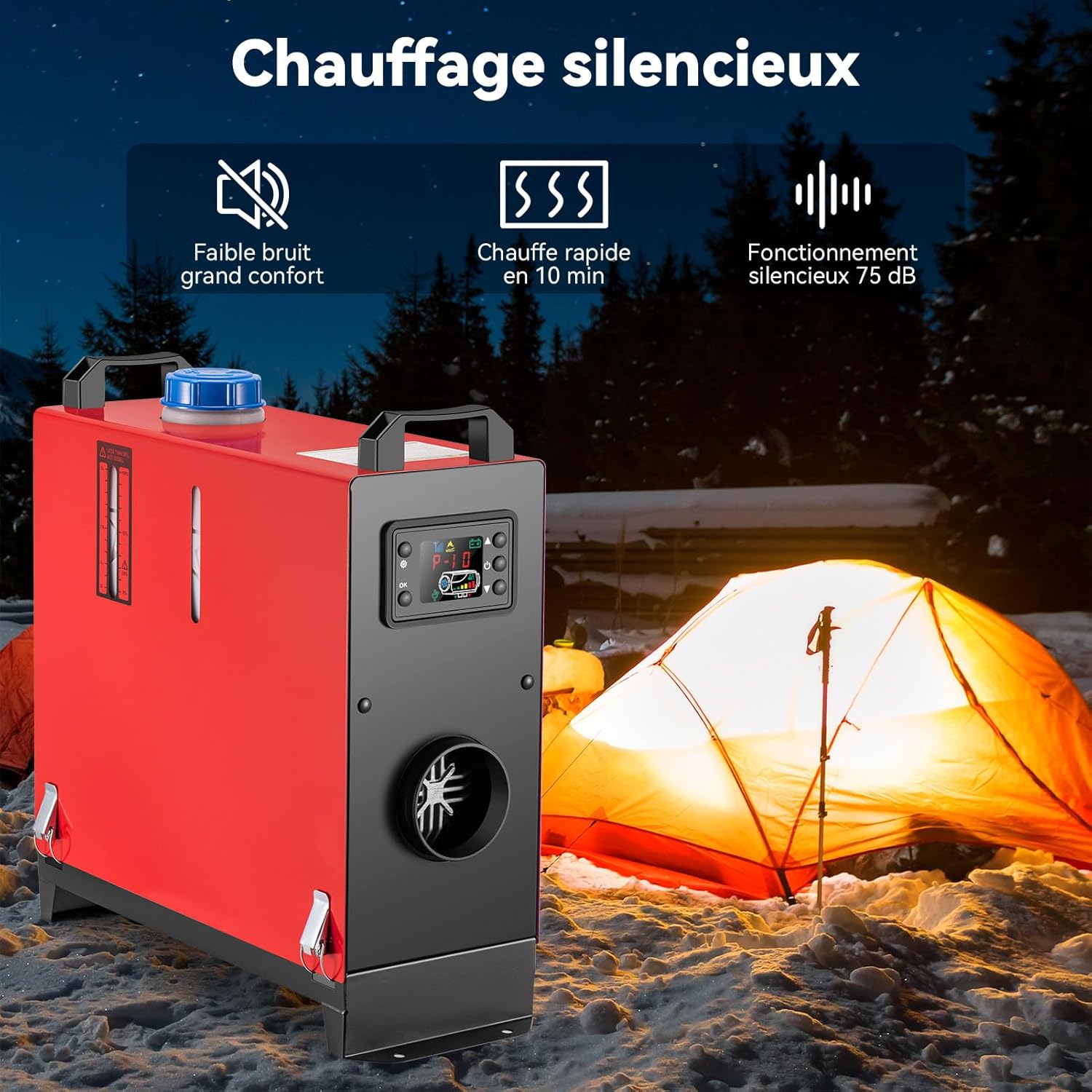 - Chauffage d’air diesel efficace – Fonctionne sur 12V/24V. Corps en alliage d’aluminium. Plage de température de fonctionnement : -40°F à +104°F. Profitez de l’hiver et de vos aventures toute l’année sans avoir froid. Vivez des voyages et des séjours en camping dans la chaleur et le confort !
