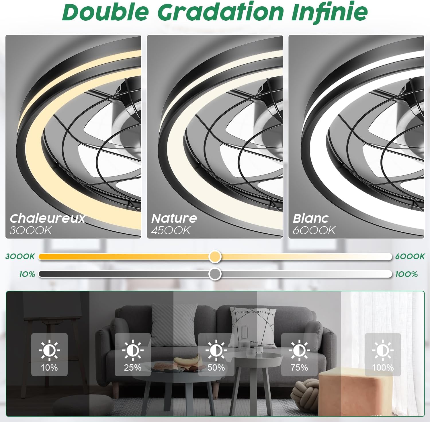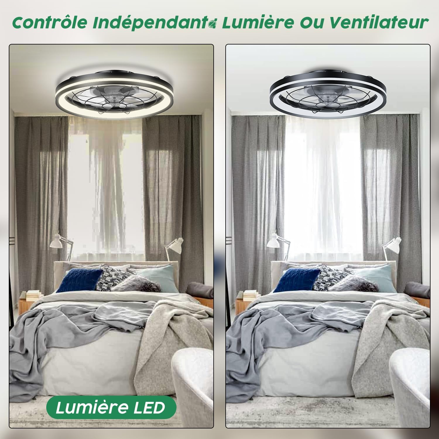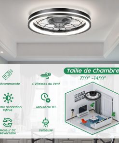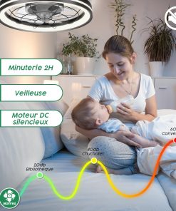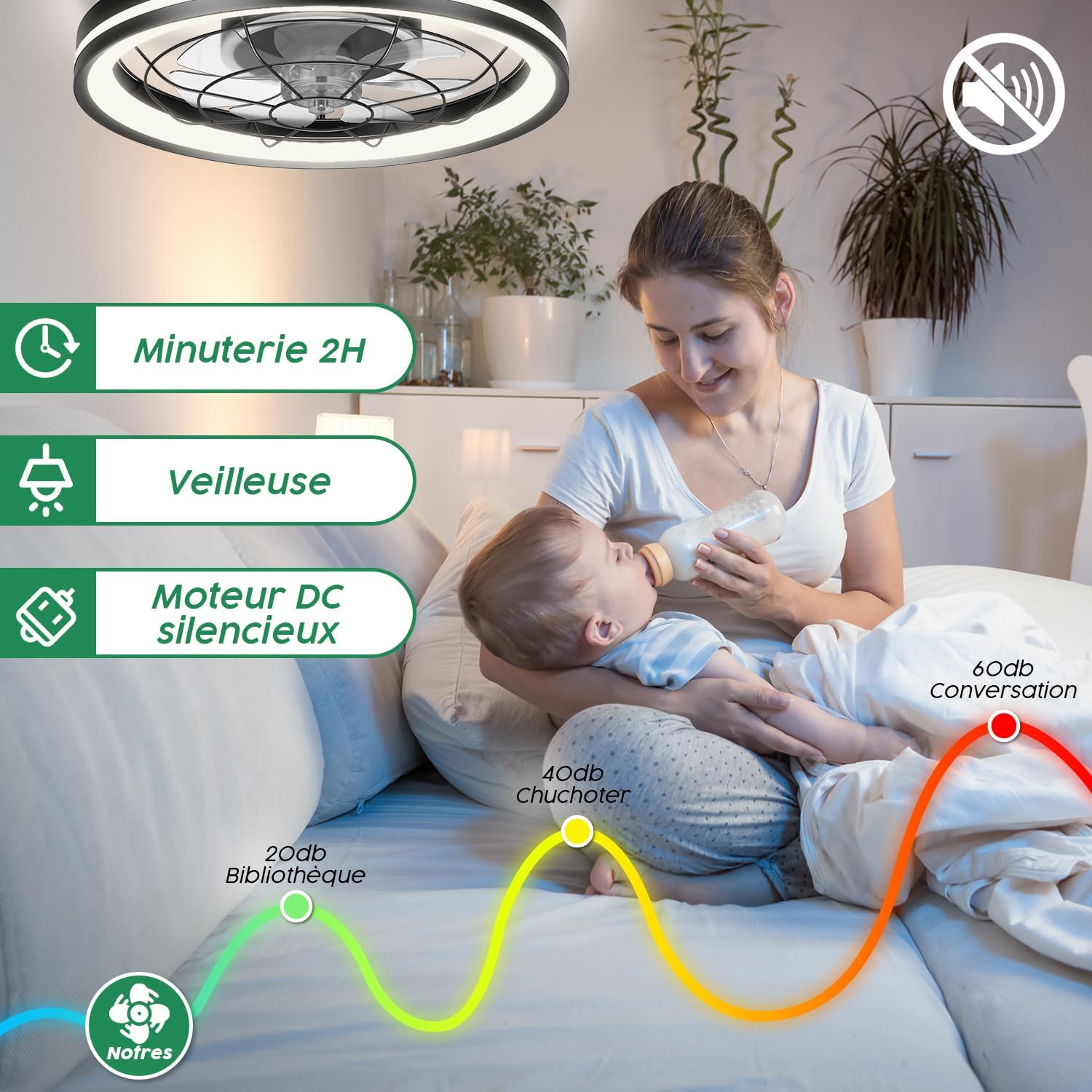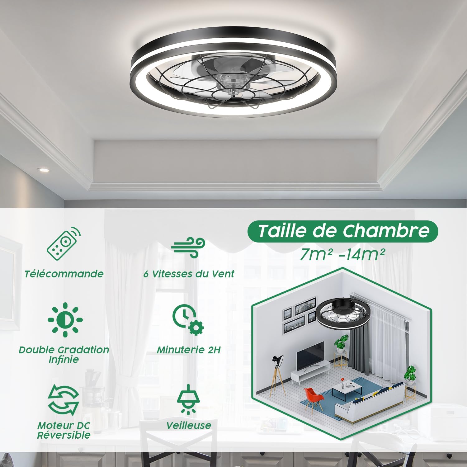 - Un Gardien Silencieux : nos ventilateurs de plafond sont dotés de moteurs DC réversibles de haute qualité, offrant des performances puissantes mais silencieuses et une circulation l’air et une gestion optimales de température en été comme en hiver. Lorsque vous avez envie d’une brise rafraîchissante, vous appuyez sur le bouton télécommande, qui n’émet aucun bip irritant, et ventilo commence à tourner. Silencieux et efficaces, nos ventilateur plafond avec lumiere sont parfaits en toute saison