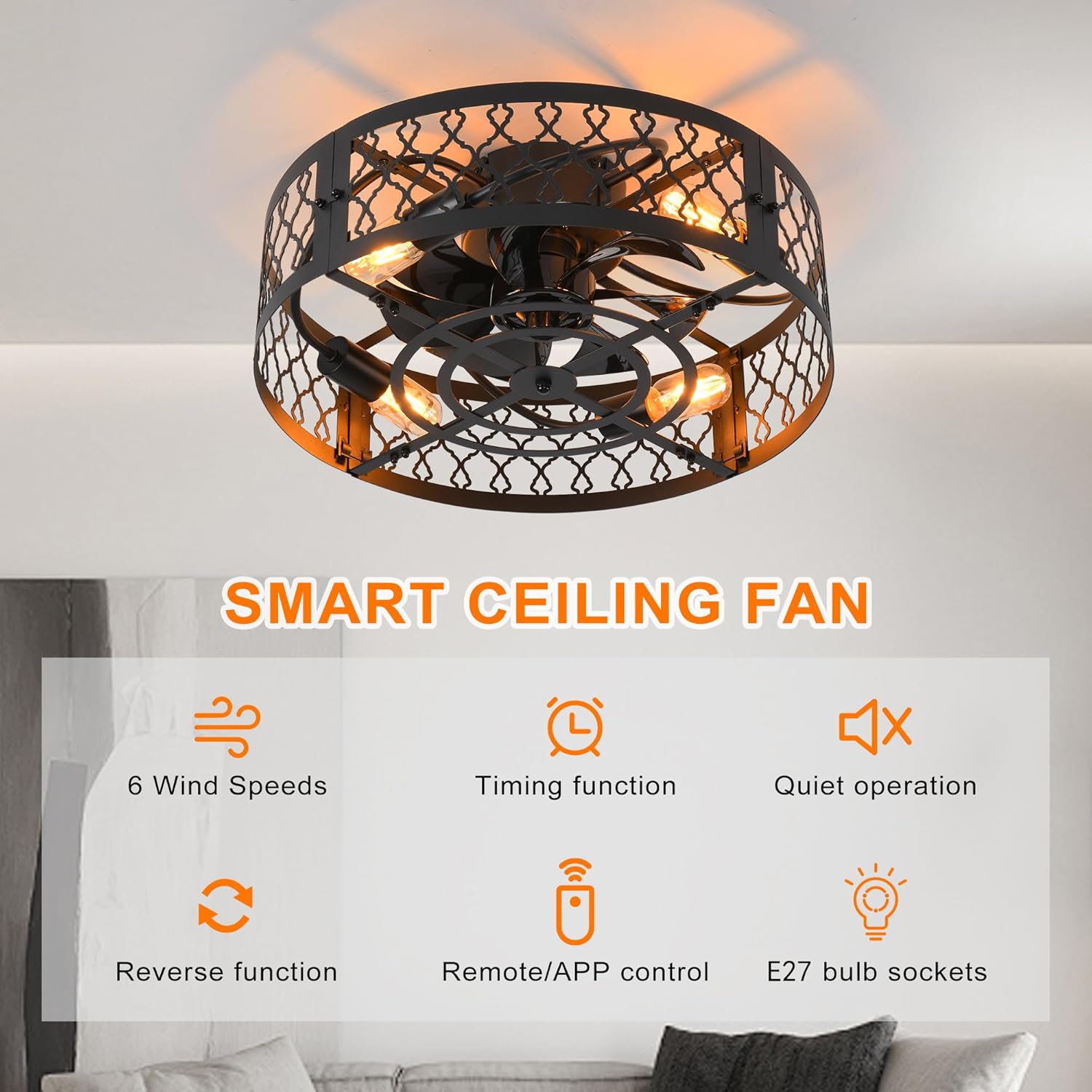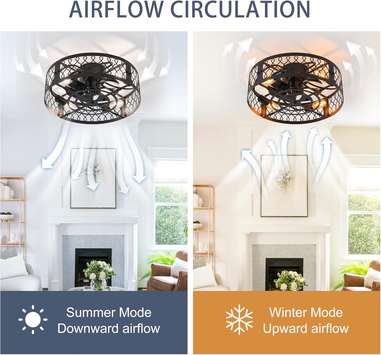 - [ Grande circulation d’air ] – 6 réglages de vitesse pour adapter le flux d’air à vos préférences. Le ventilateur fonctionne silencieusement et efficacement, qu’il s’agisse d’une brise douce pour l’ambiance ou d’une forte rafale pour se rafraîchir. En hiver, changez la direction du ventilateur afin que l’air chaud recueilli près du plafond soit uniformément réparti et augmentez votre confort.