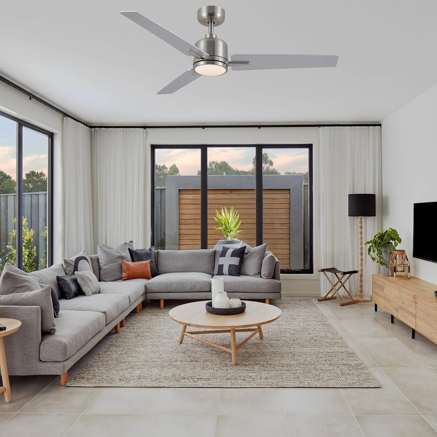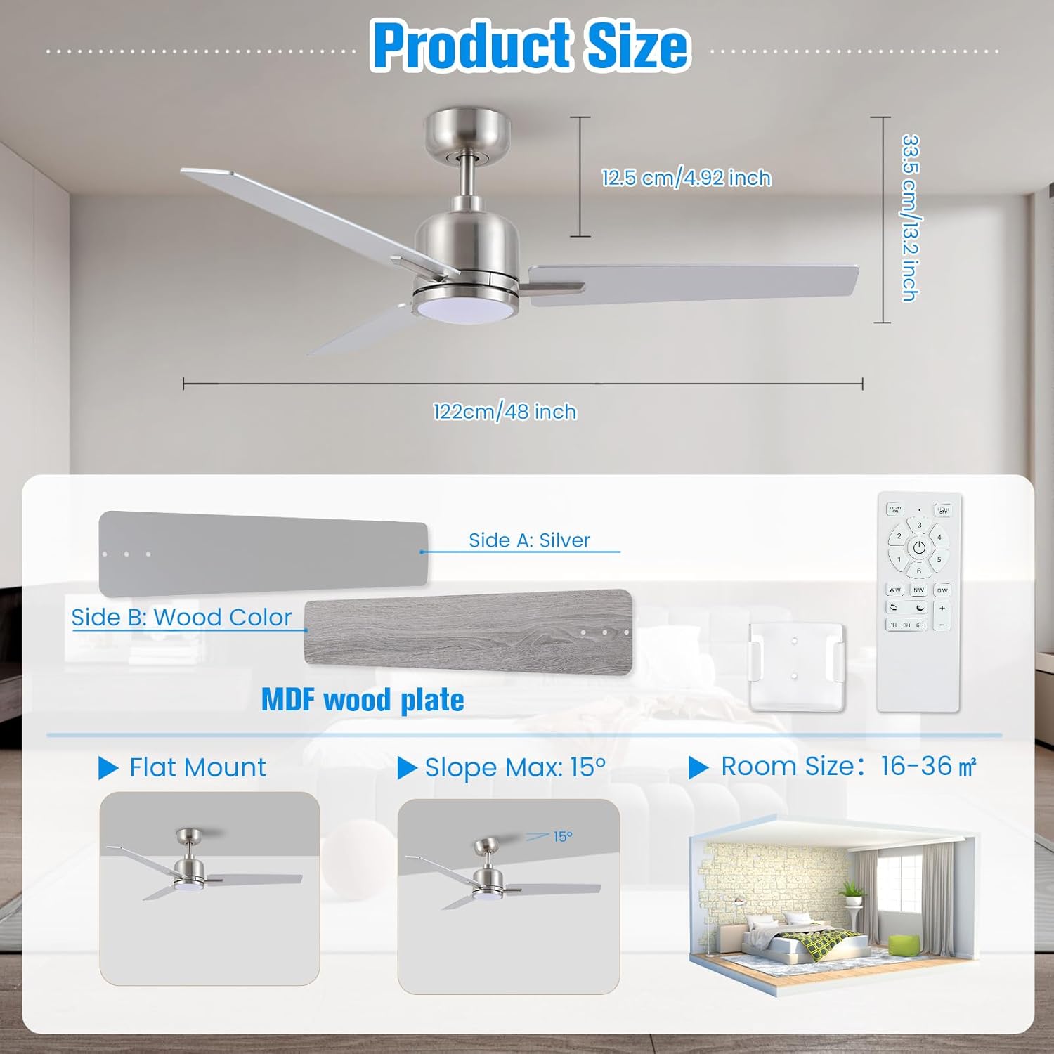 - 【Pales MDF Argent et Bois】-Ce ventilateur de plafond en bois argenté est disponible en deux couleurs de vantail: un côté en argent classique et l’autre en bois naturel. Ventilateur de plafond de serre pour chambre à coucher, salon, étude, sous – sol, salle de gym, cuisine, café, couloir, terrasse, grenier