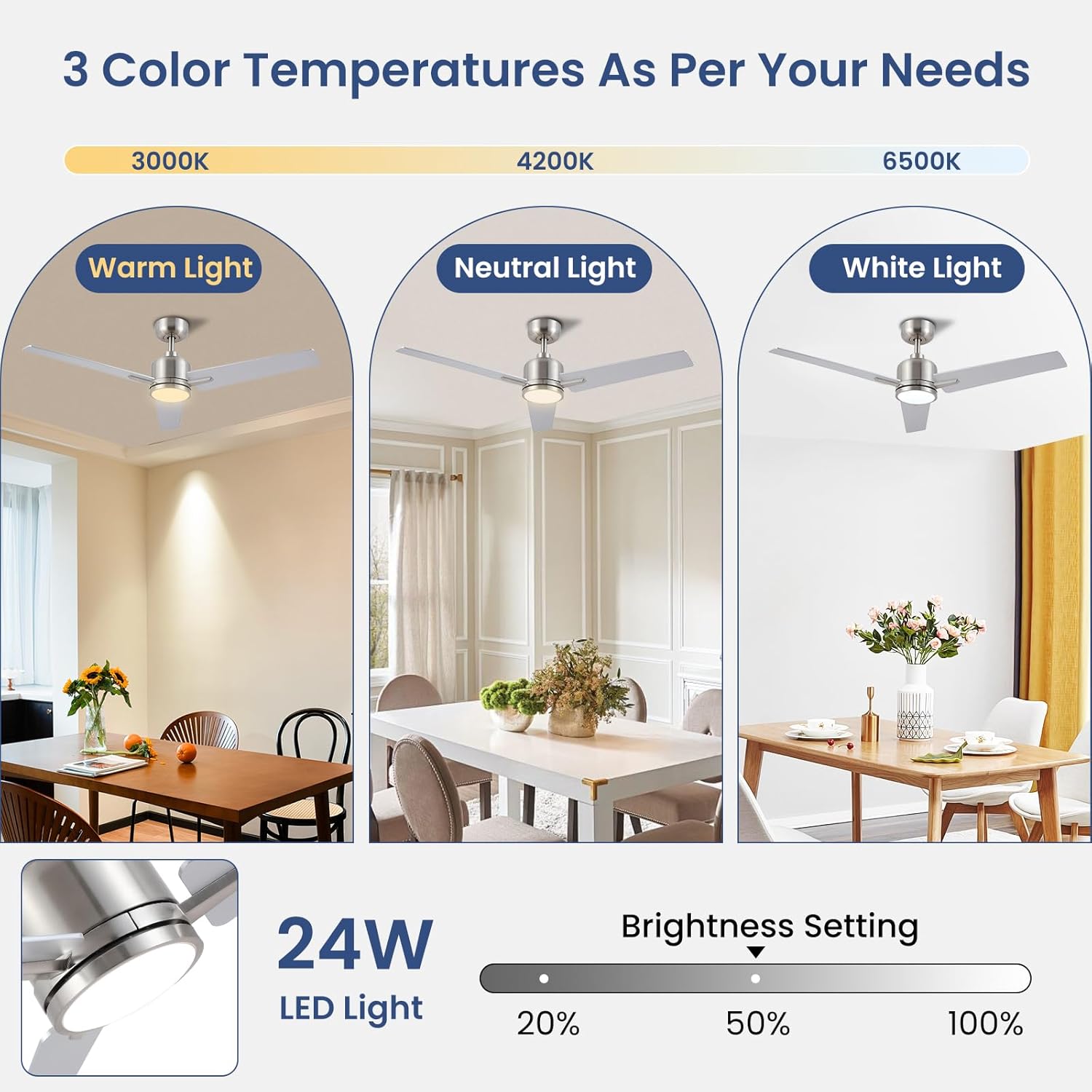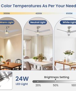 - 【Classe Energétique E – More Efficiency】- les ventilateurs de plafond sont améliorés à la classe énergétique e, ce qui les rend plus économes en énergie que la plupart des ventilateurs de plafond à Lampes sur le marché. 3 température de couleur 3000k (blanc chaud), 4000k (lumière naturelle), 6500k (blanc froid). 24W LED avec une gamme de luminosité de 20% – 100% (460 – 2300lm).