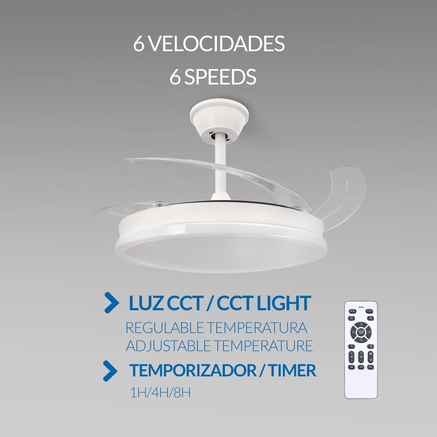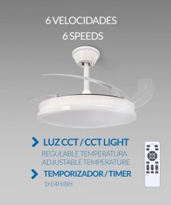Buena calidad y fácil montaje. El mando ofrece varias funciones de luz (tipo e intensidad) y del ventilador con diferentes velocidades. No hace ruido y, cuando el ventilador está apagado, las aspas se recogen y queda una lámpara de diseño moderno y muy bonita.