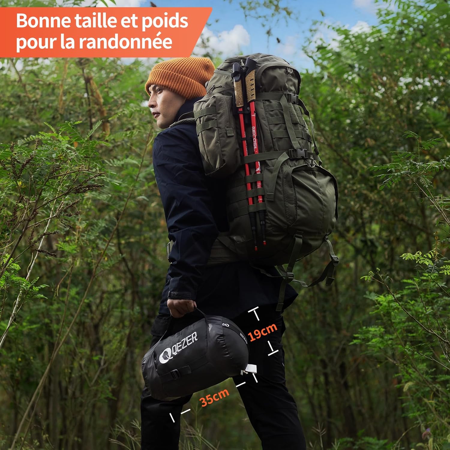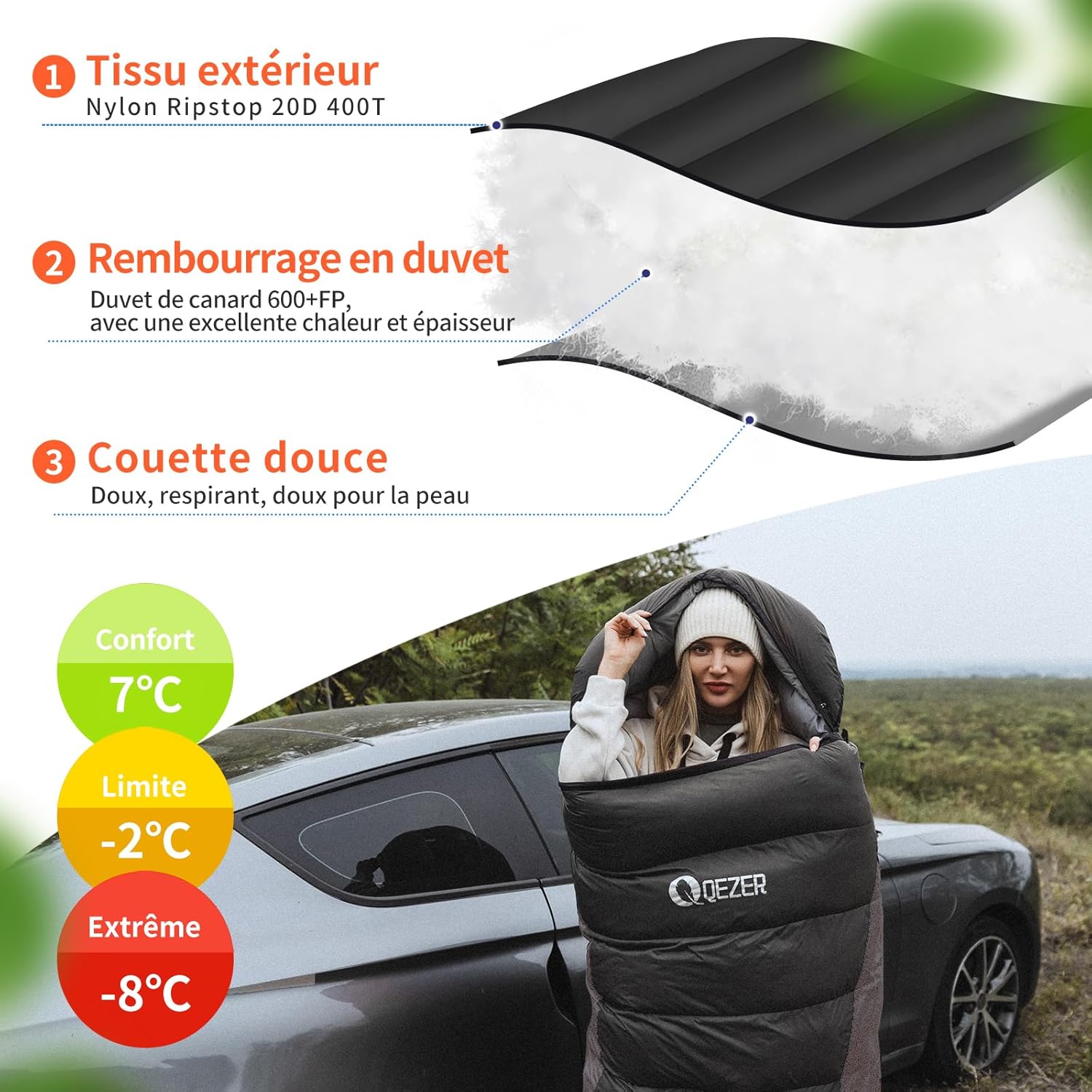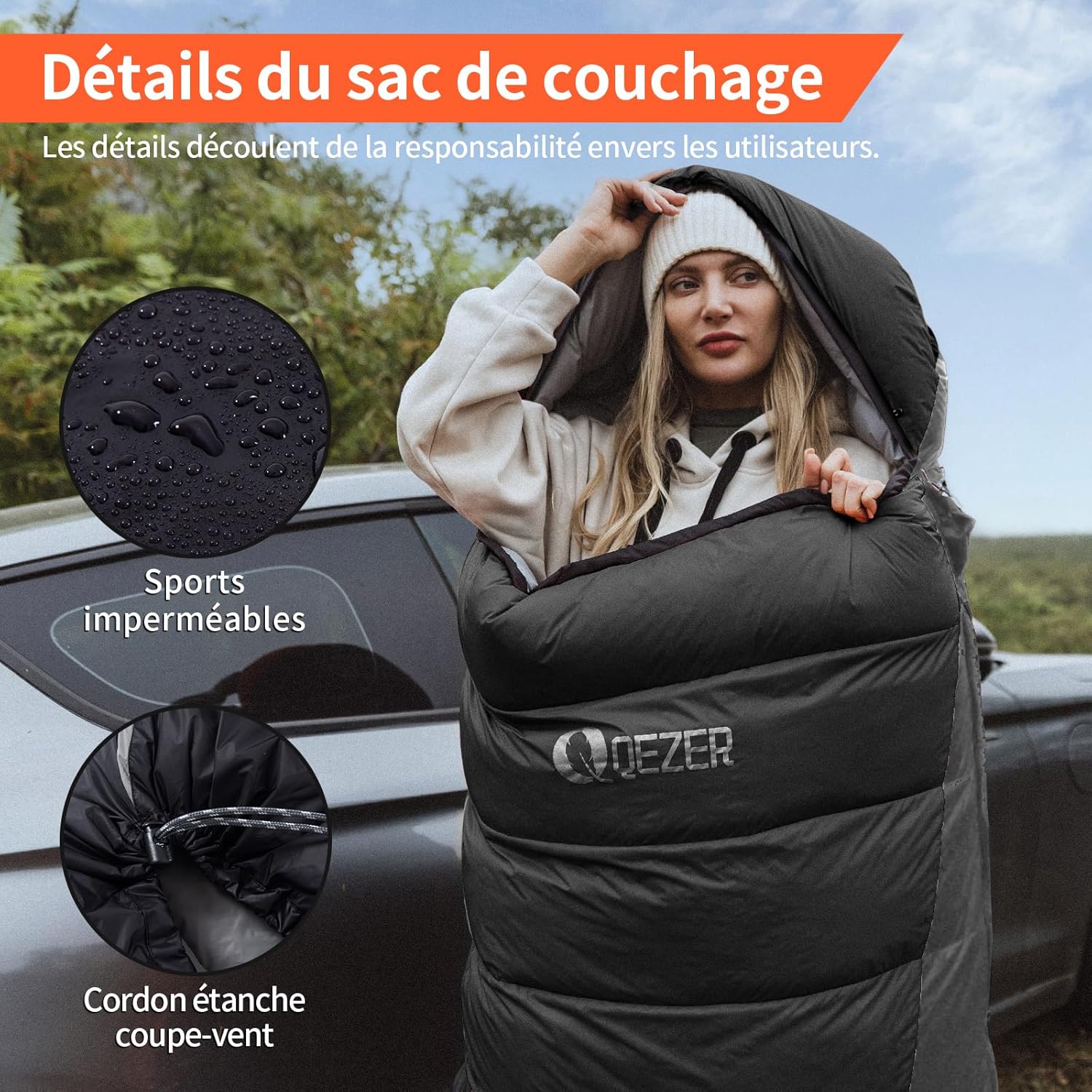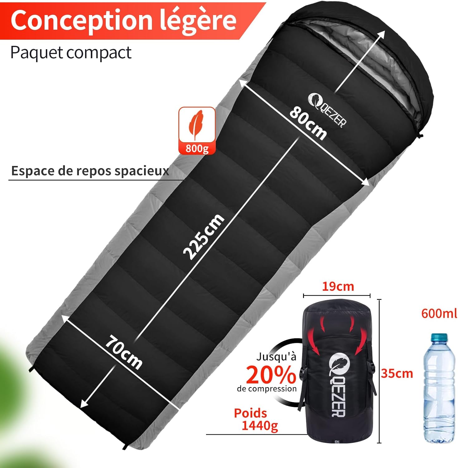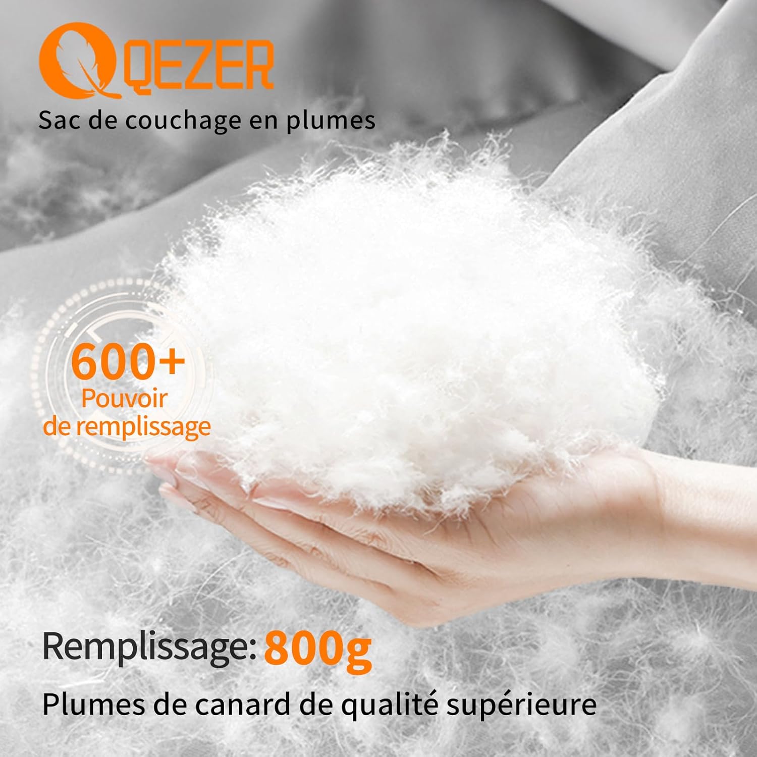 - Service après-vente sérieux : QEZER est convaincu qu’un sommeil réparateur est essentiel aux aventures en plein air. Que ce soit pour le camping, la randonnée ou d’autres activités de plein air, nos sacs de couchage en duvet seront votre partenaire idéal. Pour toute question, n’hésitez pas à nous contacter. Nous vous répondrons dans les plus brefs délais et trouverons une solution à votre problème.