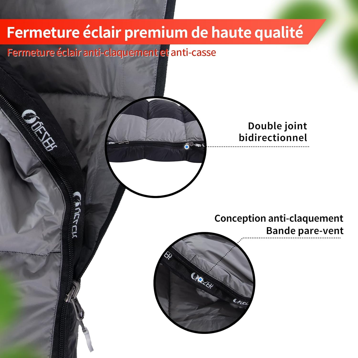- Duvet de haute qualité : Sac de couchage pour adulte garni de 800 g de duvet de canard certifié RDS avec un pouvoir gonflant de 600 FP. Pur et naturel, sain, respectueux de l’environnement, doux pour la peau, inodore et exempt d’impuretés, plus léger et plus chaud, il vous garde au chaud lors des nuits froides. Idéal pour la randonnée, le camping et la randonnée en plein air.