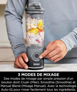 Le Ninja Blast au max ! Voici le mixeur portable Ninja Blast Max, doté d’un gobelet de 570 ml*, de 3 modes de mixage et de couleurs tendance pour tous les styles. Vinaigrettes, smoothies, sauces ou granités, créez toute une gamme de saveurs grâce au mixeur sans fil le plus puissant de Ninja. La lame CrushBlade pile la glace, les fruits congelés et les ingrédients les plus coriaces, dans un design léger et nomade. Sa conception Twist-and-go le rend facile à utiliser : ajoutez les ingrédients, mixez, faites tourner la tasse pour la retirer et c’est parti. La technologie Auto-iQ vous simplifie la tâche avec 2 programmes automatiques (Smoothie et Crush) et un mode de mixage manuel. Avec sa poignée de transport, son couvercle étanche et son bec verseur, il est parfait en voyage. Préparez une vinaigrette pour une salade fraîche au bureau, ou dégustez une boisson protéinée après une séance de sport. Les possibilités sont infinies. La tasse et le couvercle sont lavables au lave-vaisselle. Inclut : base moteur, tasse de mixage 570 ml*, couvercle étanche, câble de chargement et guide de recettes. Faites de votre cuisine une cuisine Ninja. *Capacité max. 490 ml.