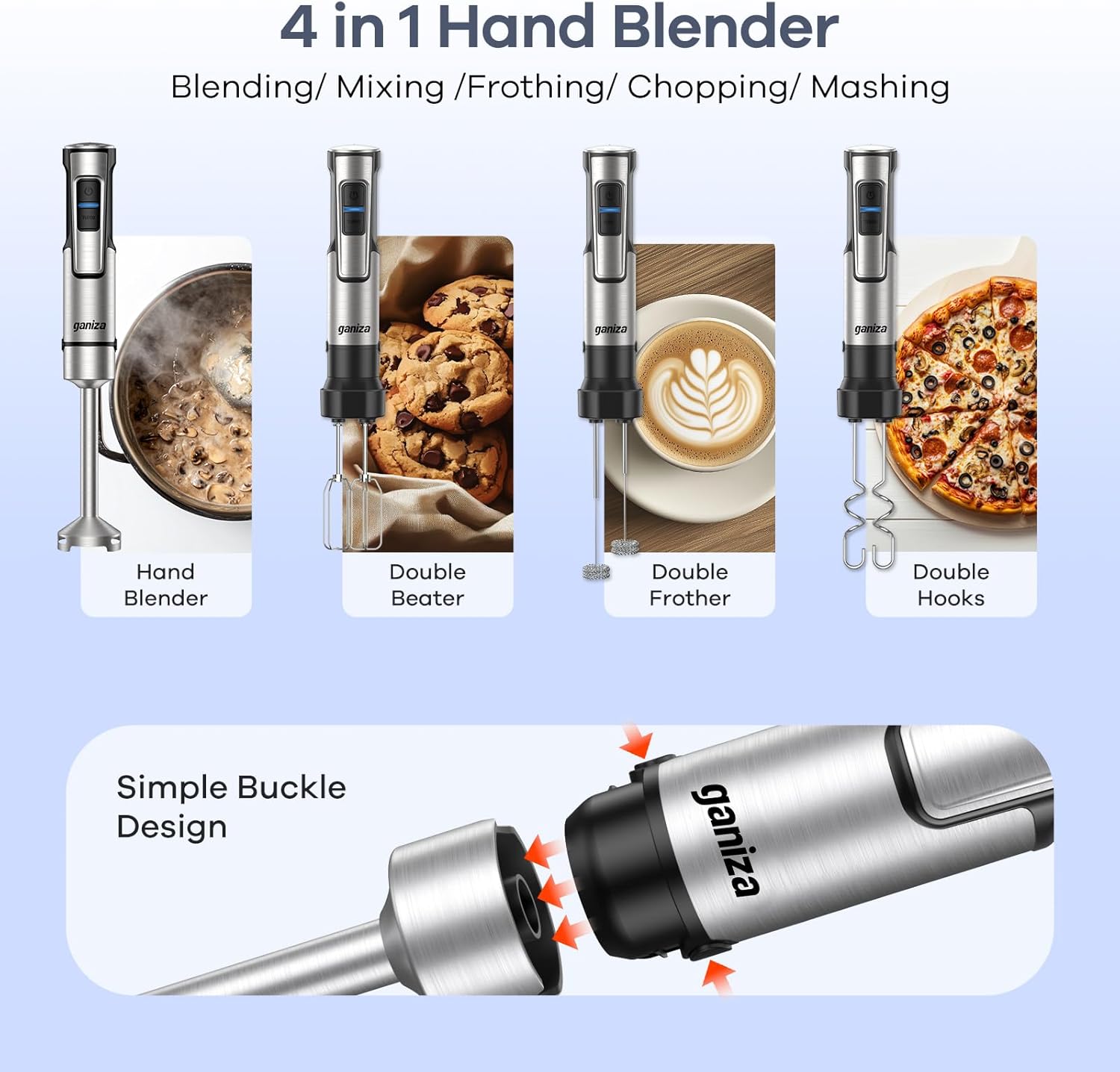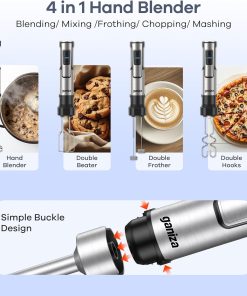 - 【5-en-1】Le mixeur plongeant Ganiza comprend : 2 crochets pétrisseurs, 2 mousseurs à lait, 2 fouets, 1 gobelet de mélange de 800 ml et 1 hachoir. Idéal pour mixer, fouetter, émulsionner ou hacher rapidement vos préparations — le compagnon parfait pour des repas faits maison en un rien de temps.