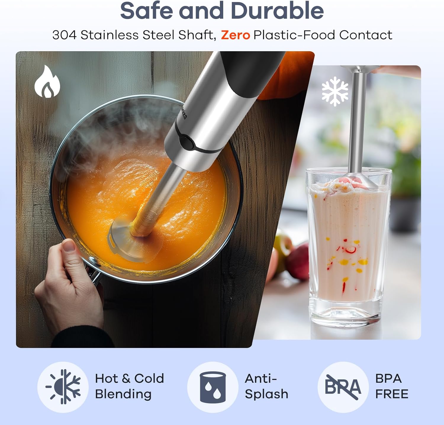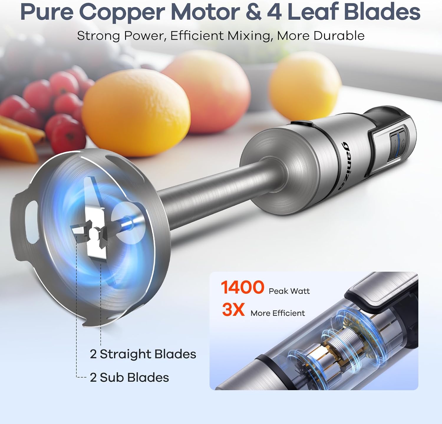 - 【Moteur Puissant】Équipé d’un moteur en cuivre de 1200W et d’une lame inox à quatre couteaux, le mixeur plongeant Ganiza assure un mixage rapide et efficace, même avec les ingrédients les plus durs.