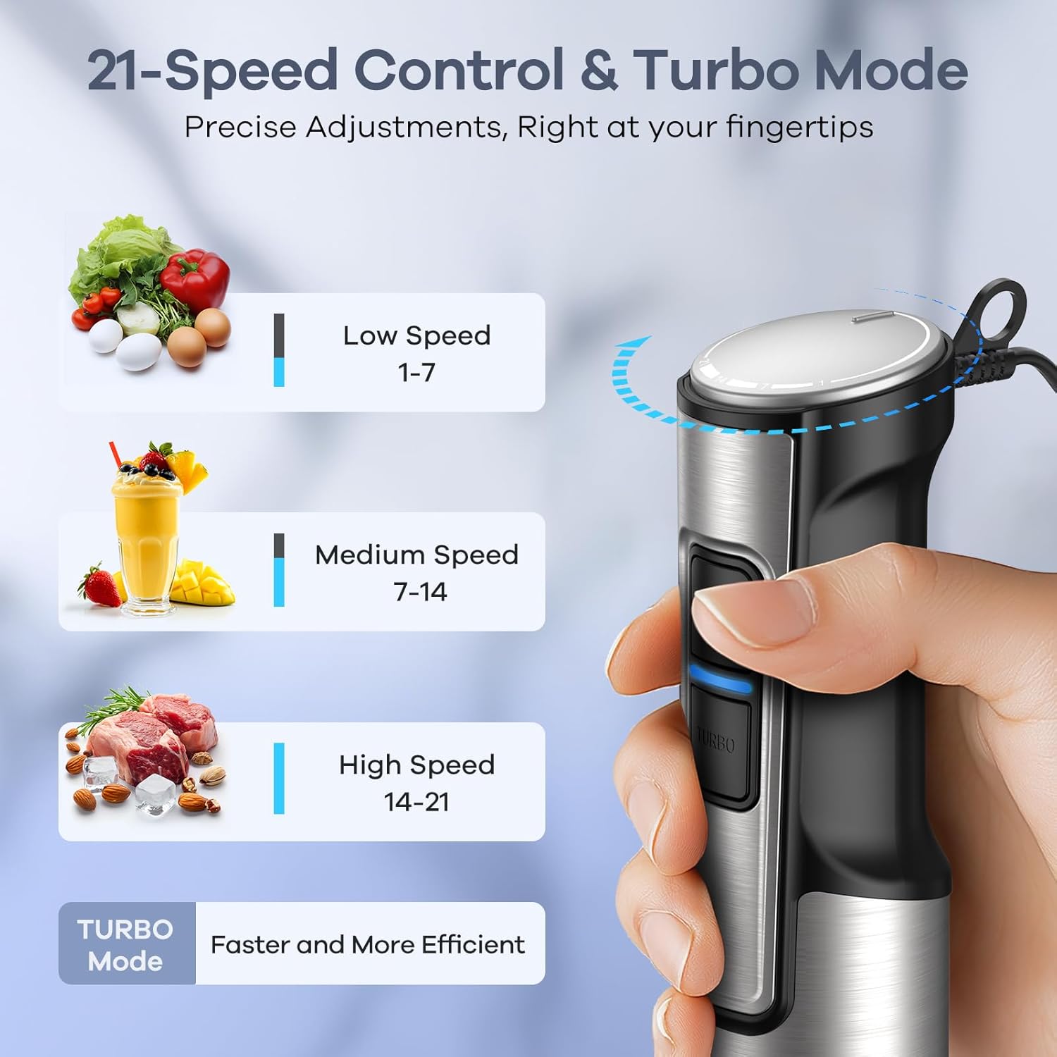 - 【21 Vitesses & Mode TURBO】Les 21 niveaux de vitesse vous offrent un contrôle précis pour répondre à différents besoins de mixage. Le mode TURBO atteint instantanément la vitesse maximale pour un boost de puissance.