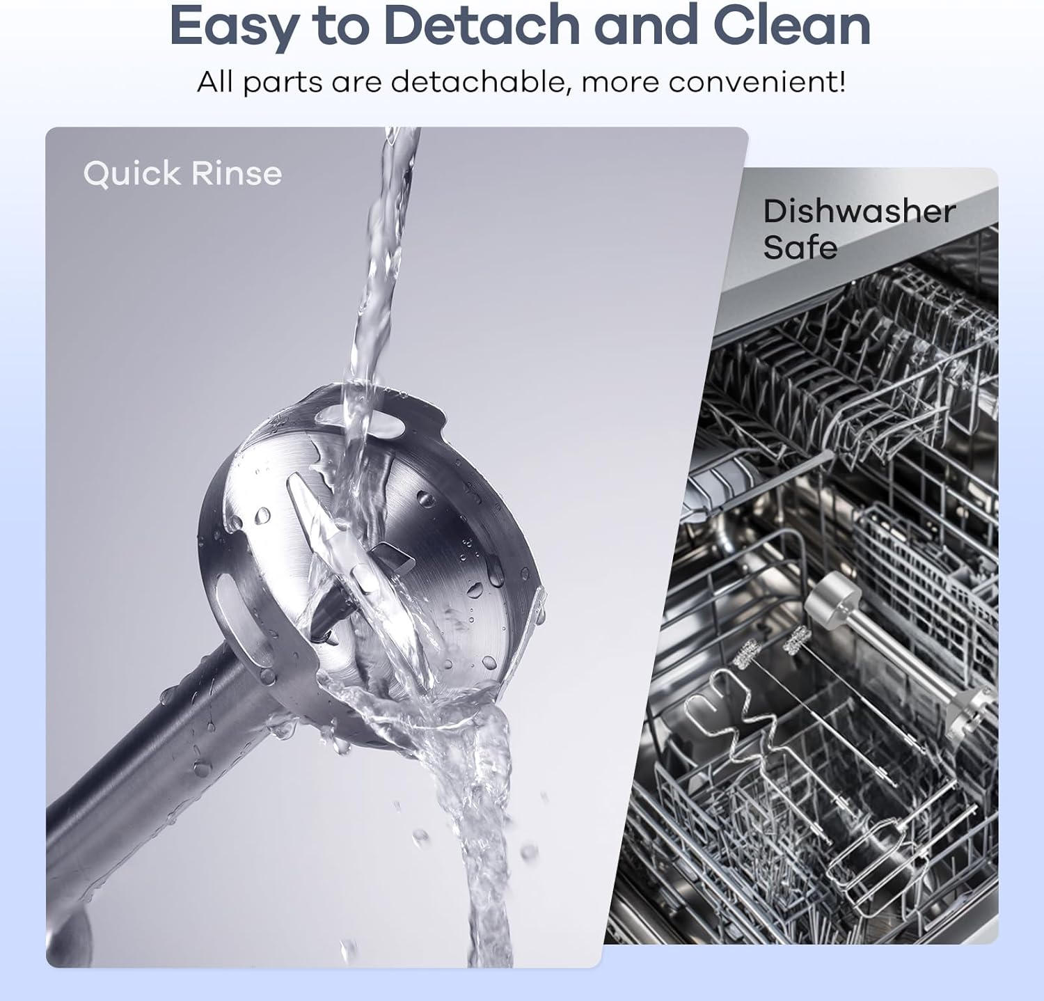 - 【Nettoyage Facile】Tiges et accessoires amovibles lavables au lave-vaisselle ou à la main (hors bloc moteur et couvercle). Le bloc moteur se nettoie d’un simple coup de chiffon.