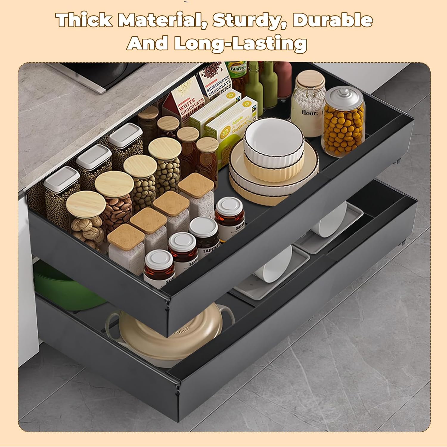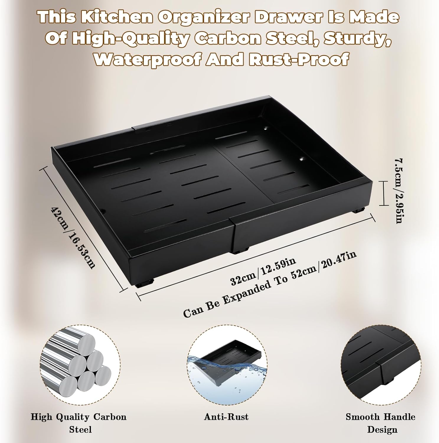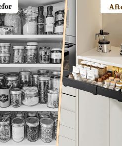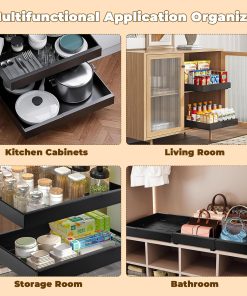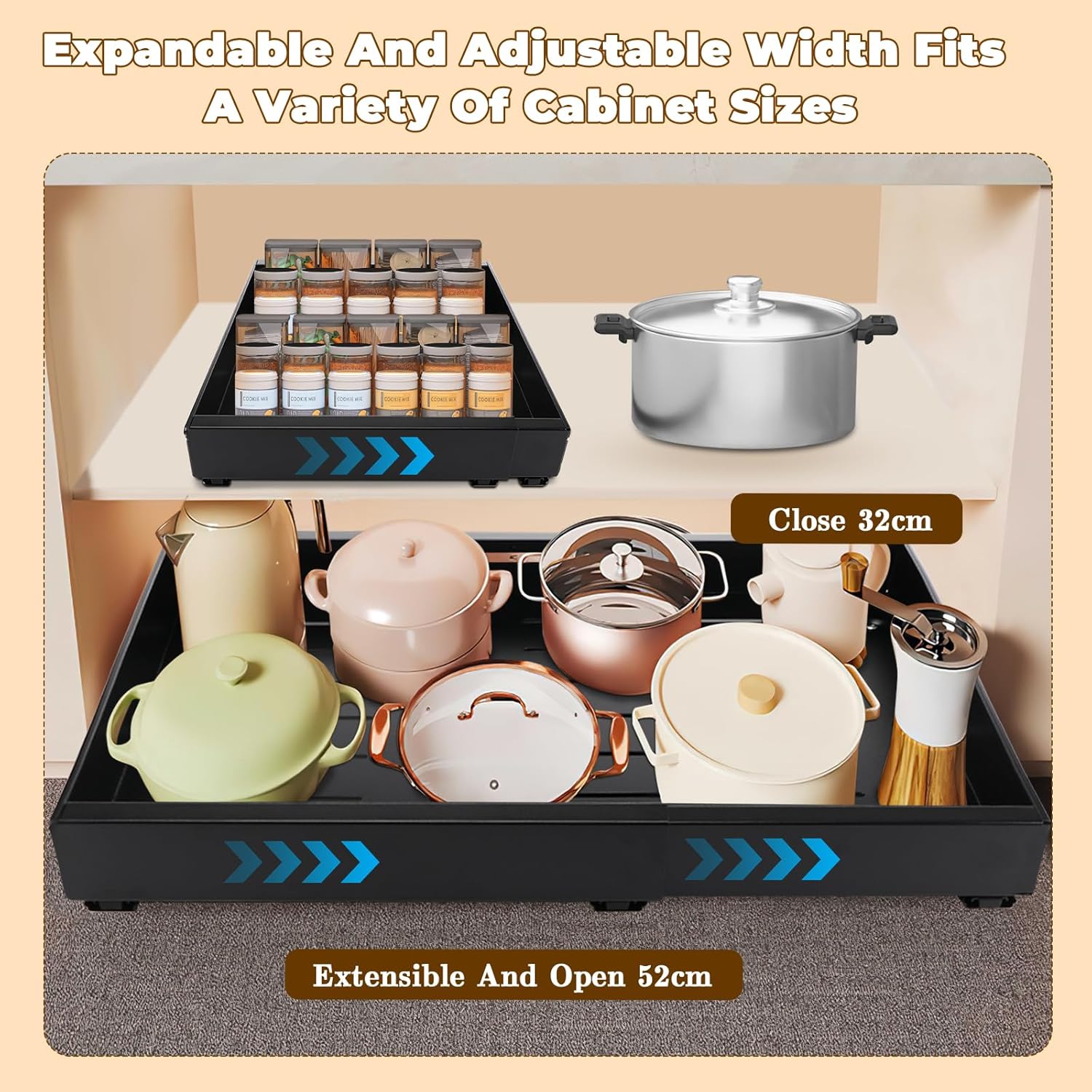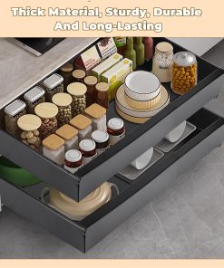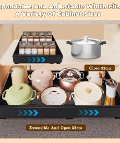 Tiroir Coulissant Cuisine Adhesif, Rangement Coulissant Placard Cuisine Noir, Tiroir Télescopique Extensible Largeur Ajustable 32-52cm, Sans perçage ni Clouage Requis (1 Pièces)
