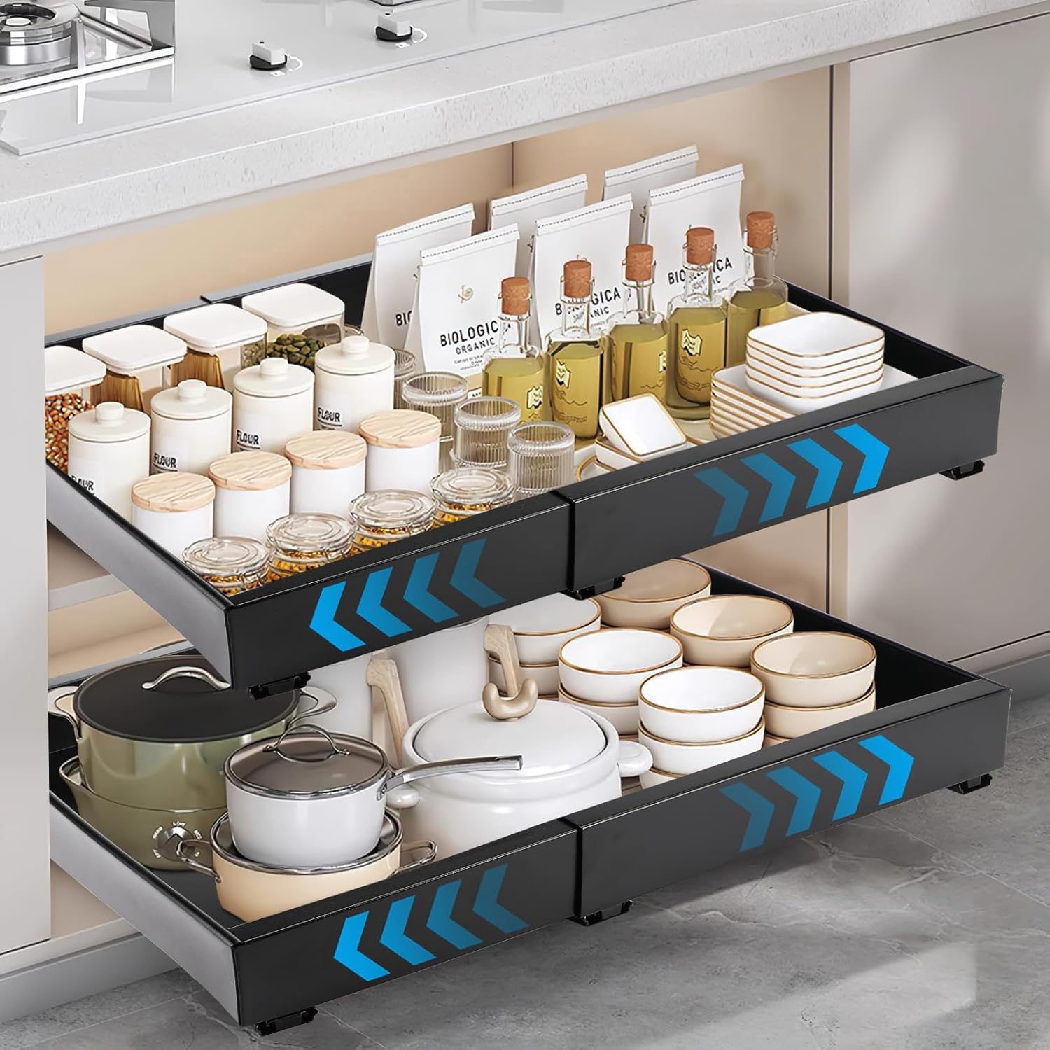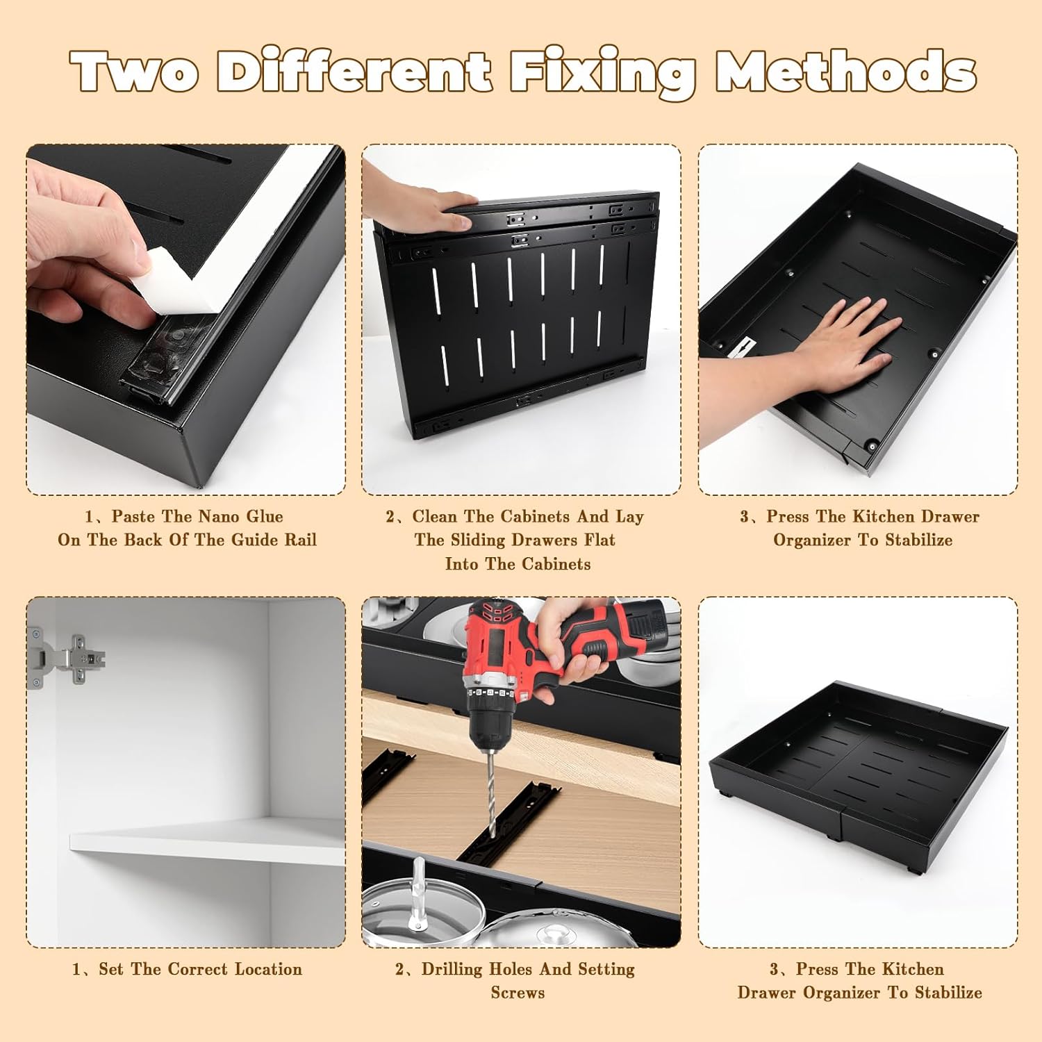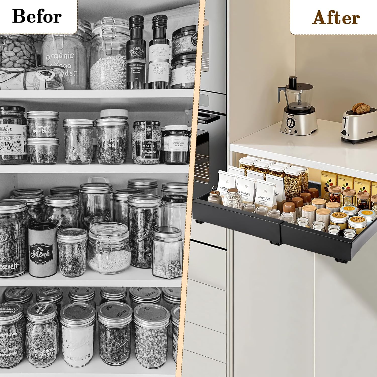 Tiroir Coulissant Cuisine Adhesif, Rangement Coulissant Placard Cuisine Noir, Tiroir Télescopique Extensible Largeur Ajustable 32-52cm, Sans perçage ni Clouage Requis (1 Pièces)