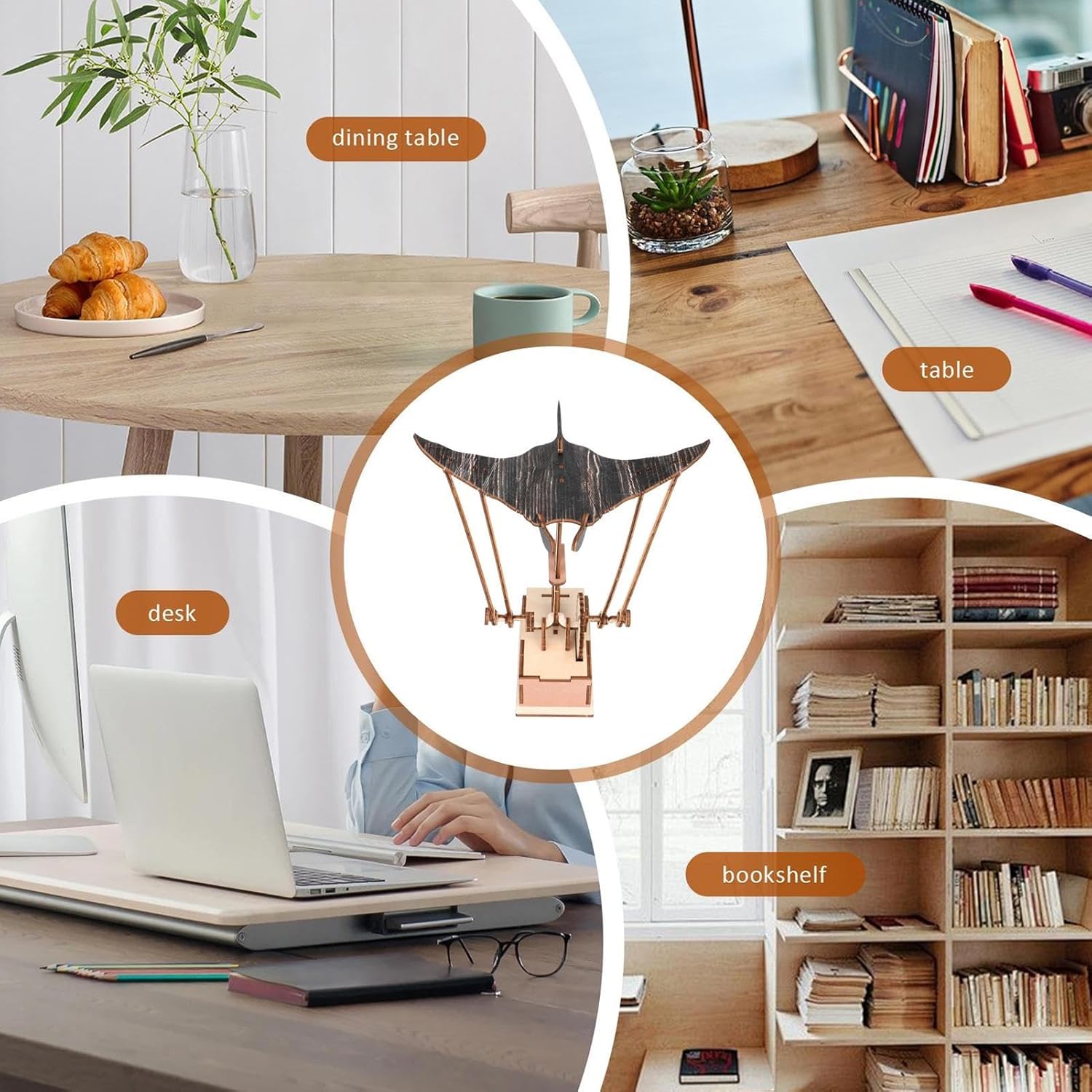 Article bien réalisé et discret, la raie manta en bois apporte une jolie touche décorative au bureau. La finition est soignée, le mouvement est fluide et l’ensemble donne une impression réaliste sans être envahissant. Bon rapport qualité-prix.