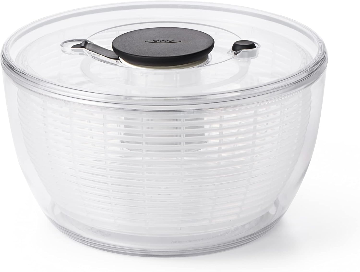 OXO Good Grips 1351580V2MLNYK Essoreuse à salade transparent/blanc, Plastique, Grand L’essoreuse à salade que nous avons présentée en 1998 a transformé l’ustensile en un élément de cuisine quotidien essentiel. Nous avons revisité l’essoreuse pour effectuer quelques améliorations tout en conservant les caractéristiques principales et l’inspiration originale : une toupie pour enfants. Avec un design moderne qui complète les cuisines contemporaines et un frein amélioré qui l’arrête net à chaque fois, nous pensons que vous allez adorer notre nouvelle version du design classique. Séchez les salades vertes d’une simple pression sur la poignée douce antidérapante. La base antidérapante maintient solidement le bol sur le plan de travail, et le bouton d’arrêt intégré arrête l’essoreuse pour la vider. Le panier fait aussi office de passoire, et le couvercle se défait pour un nettoyage facile. Oxo Good Grips Shaker à Vinaigrette Préparer rapidement une vinaigrette est simple avec le shaker à vinaigrette OXO Good Grips. Le shaker étanche offre un moyen propre, soigné et pratique de mélanger, servir et conserver les vinaigrettes, les sauces et les marinades. Le haut se dévisse pour révéler une large ouverture idéale pour ajouter une variété d’ingrédients comme l’huile, le vinaigre, la mayonnaise, la moutarde, l’ail, les oignons et les épices. Le Shaker est fabriqué dans un matériau sans bisphénol A, résistant aux chocs et lavable au lave-vaisselle. Une fois les ingrédients ajoutés, vissez le haut et agitez pour mélanger rapidement les ingrédients sans les renverser. Le levier sur le haut bascule vers l’arrière pour servir et vers l’avant pour sceller. Utilisez le shaker pour conserver les restes de vinaigrette et de sauce directement dans le réfrigérateur.