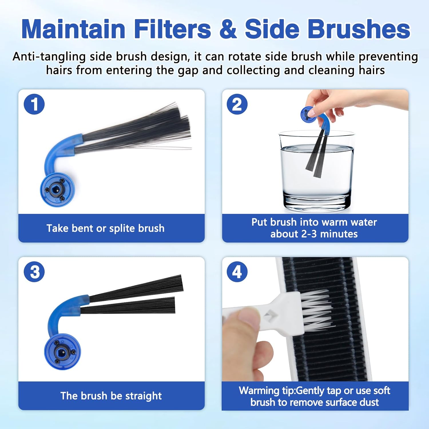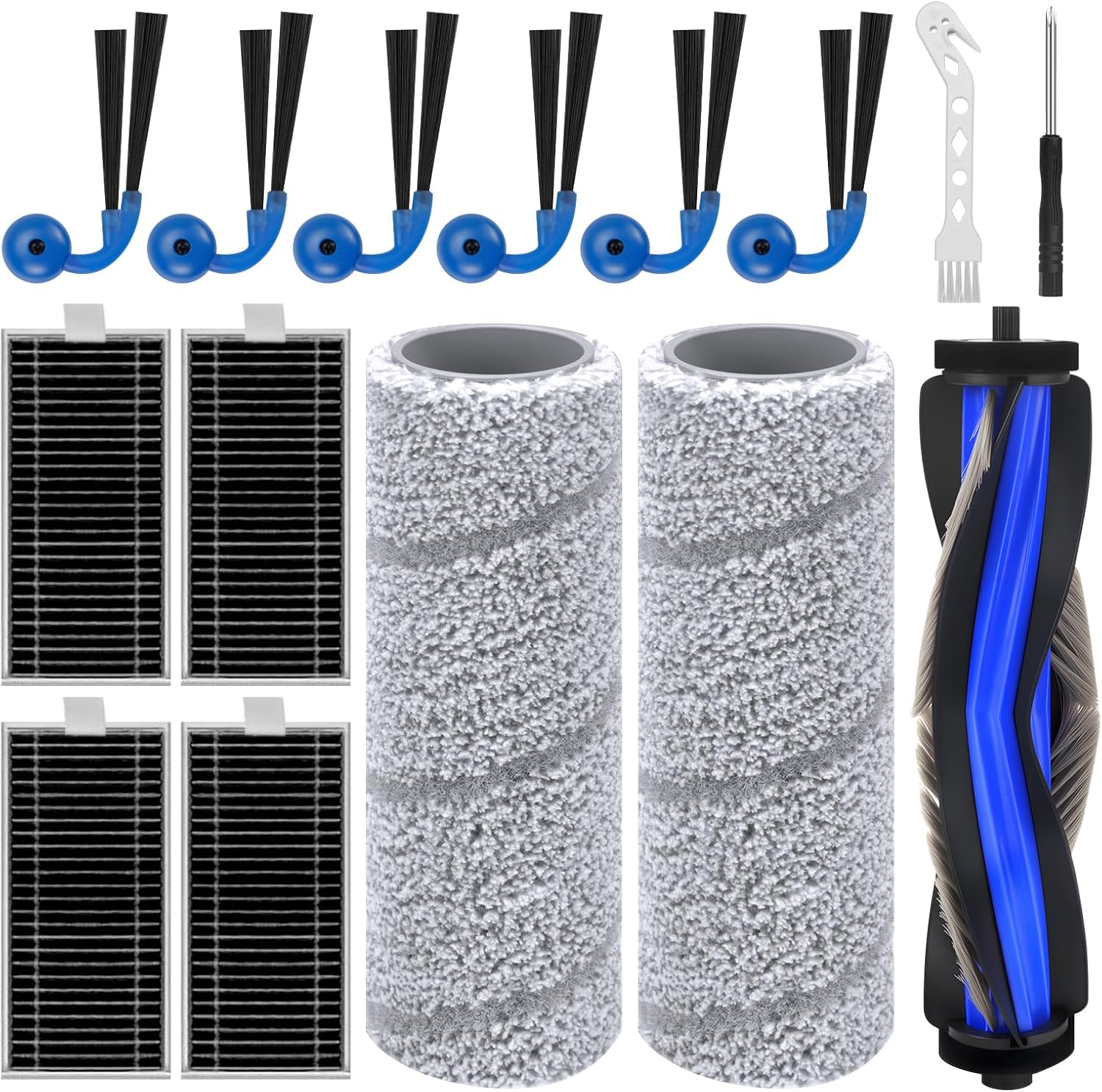 - Contenu de l’emballage : 1 brosse principale, 2 rouleaux de nettoyage, 6 brosses latérales, 4 filtres HEPA, 1 brosse de nettoyage, 1 tournevis. Pour garantir le fonctionnement optimal de votre robot aspirateur X11, nous vous recommandons de remplacer les accessoires tous les 2 à 3 mois