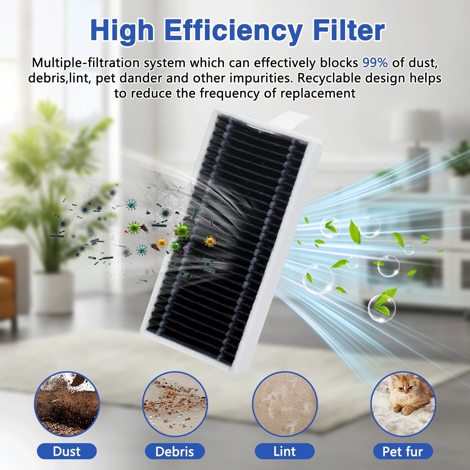 - Filtration haute efficacité : le filtre HEPA X11 peut capturer 99,97 % de la poussière, de la saleté et des autres particules fines, ce qui lui permet non seulement d’absorber plus de saleté sur une longue période, mais aussi d’éliminer efficacement les odeurs pour garder l’air de votre maison frais