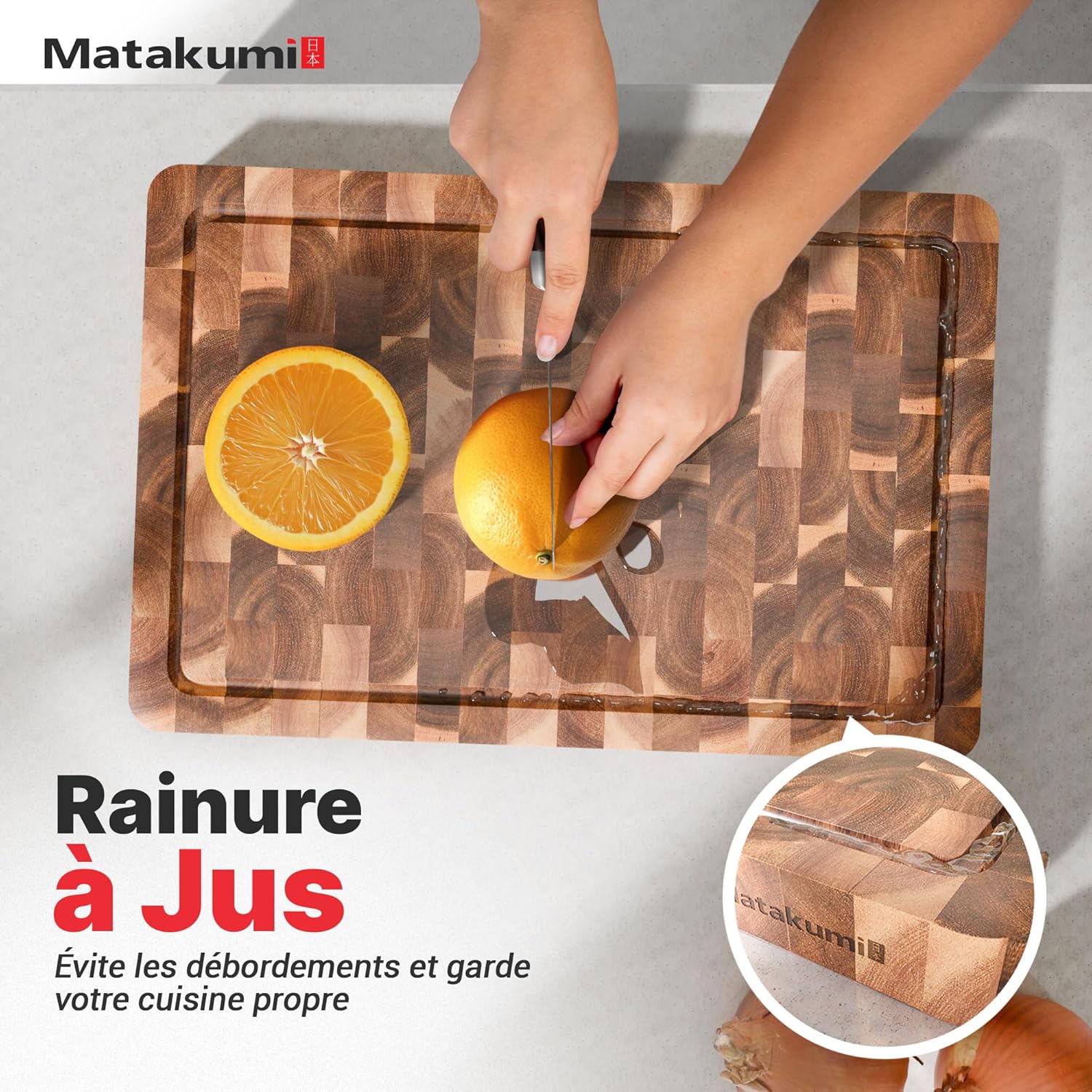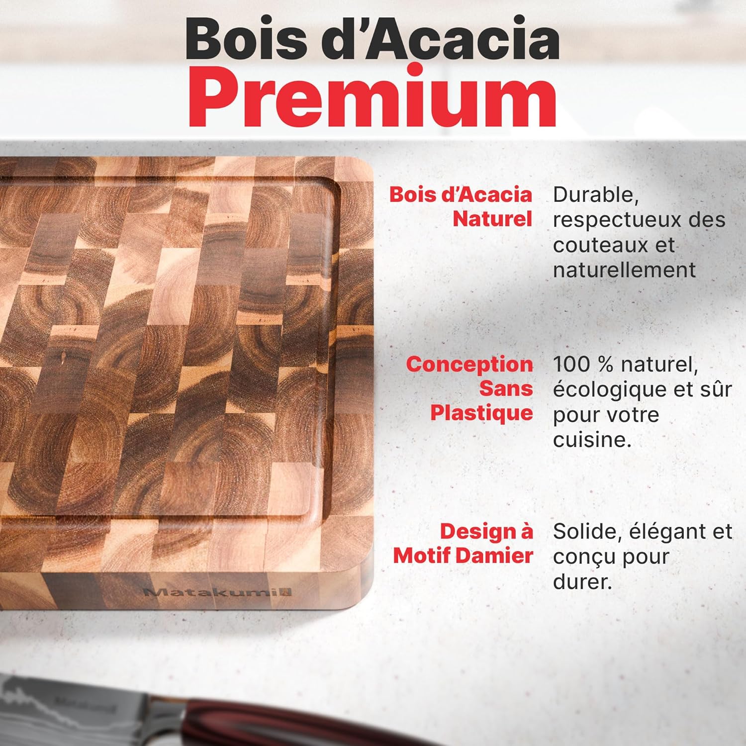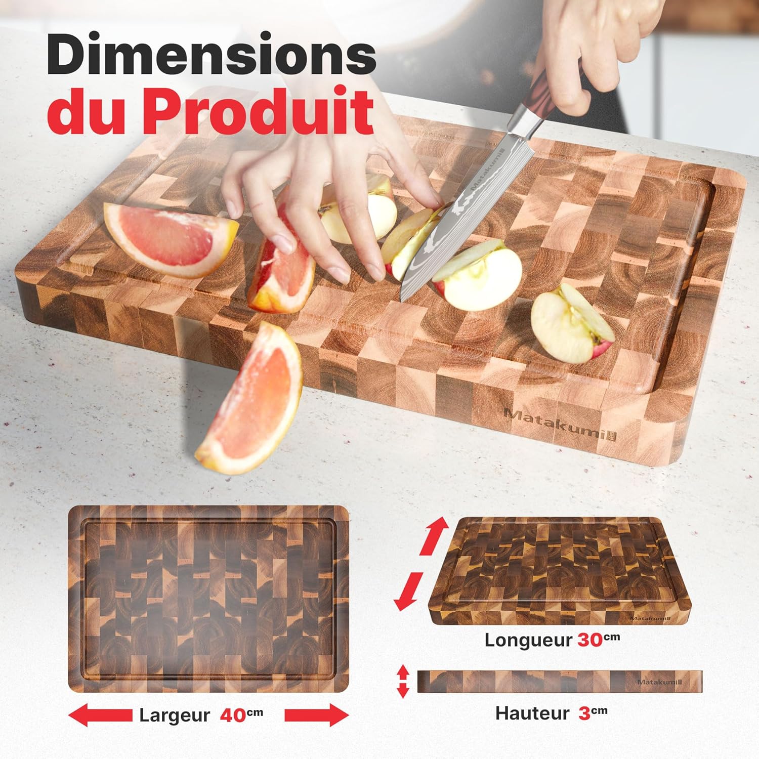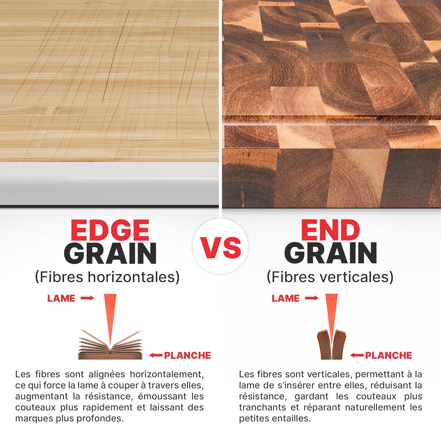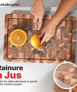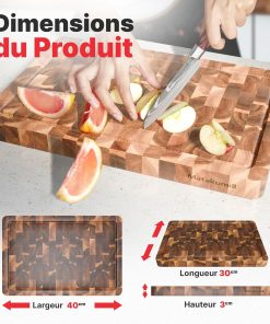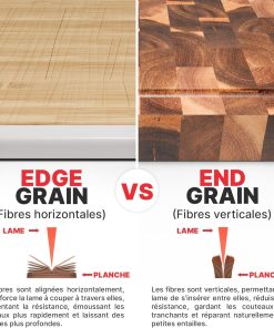 - DOUX POUR LES COUTEAUX: La construction en bois de bout de cette planche bois permet aux lames de glisser entre les fibres du bois, absorbant les chocs et réduisant l’usure. Elle préserve la netteté des lames et prolonge leur efficacité.