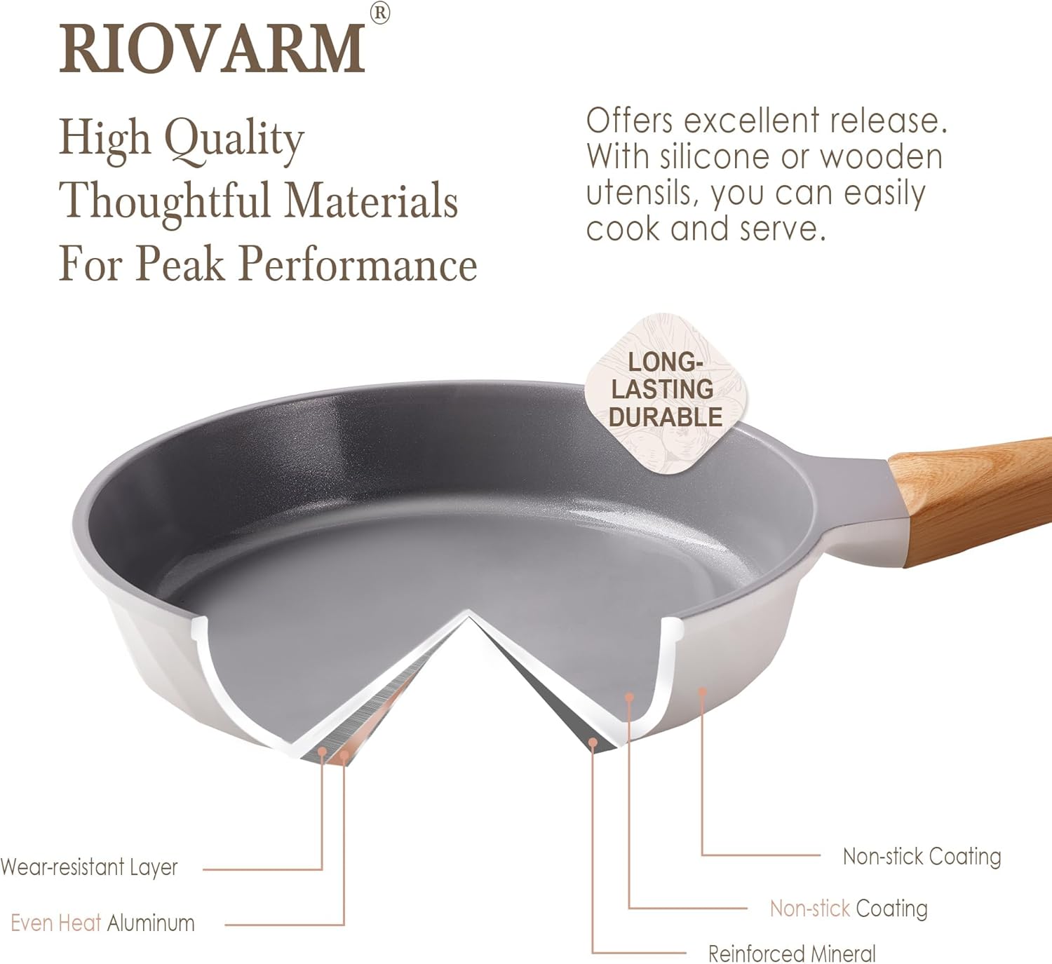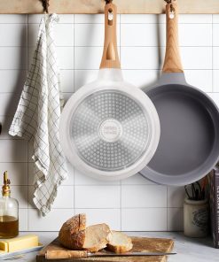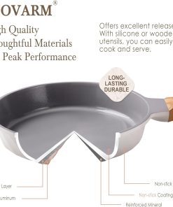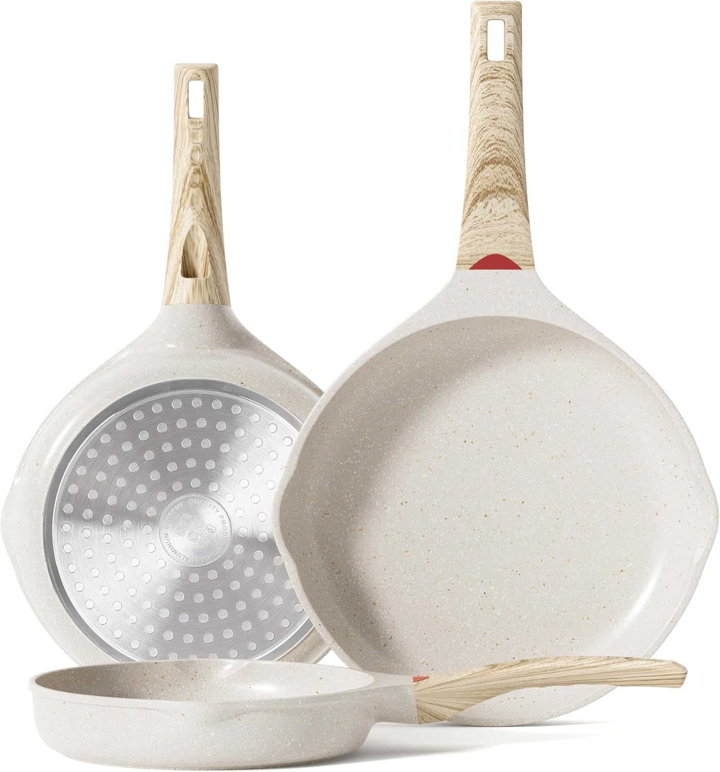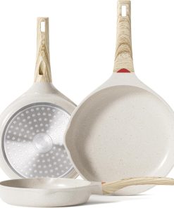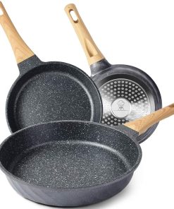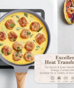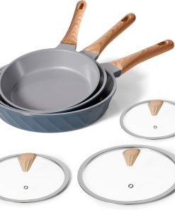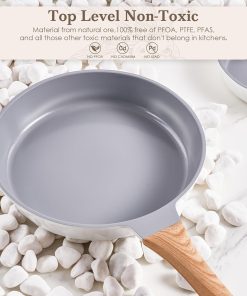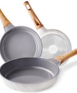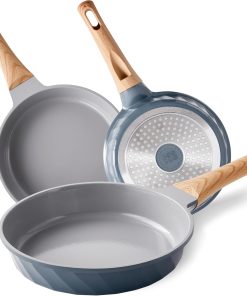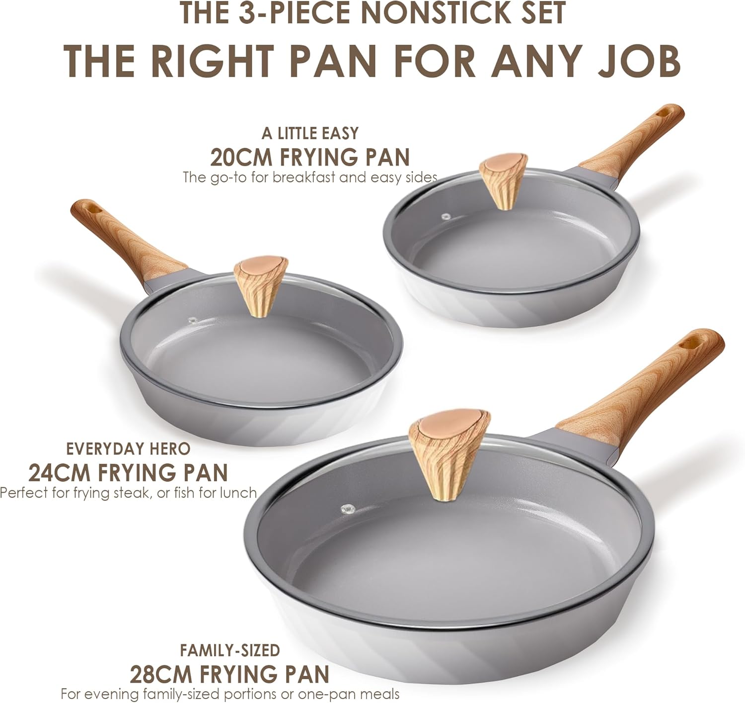 RIOVARM Céramique Antiadhésif Sets de poêles avec couvercles Induction Batteries de cuisine 20 cm 24 cm 28 cm Poêles à omelette sans PFOA Poêles à oeufs avec poignées en bakélite grain de bois