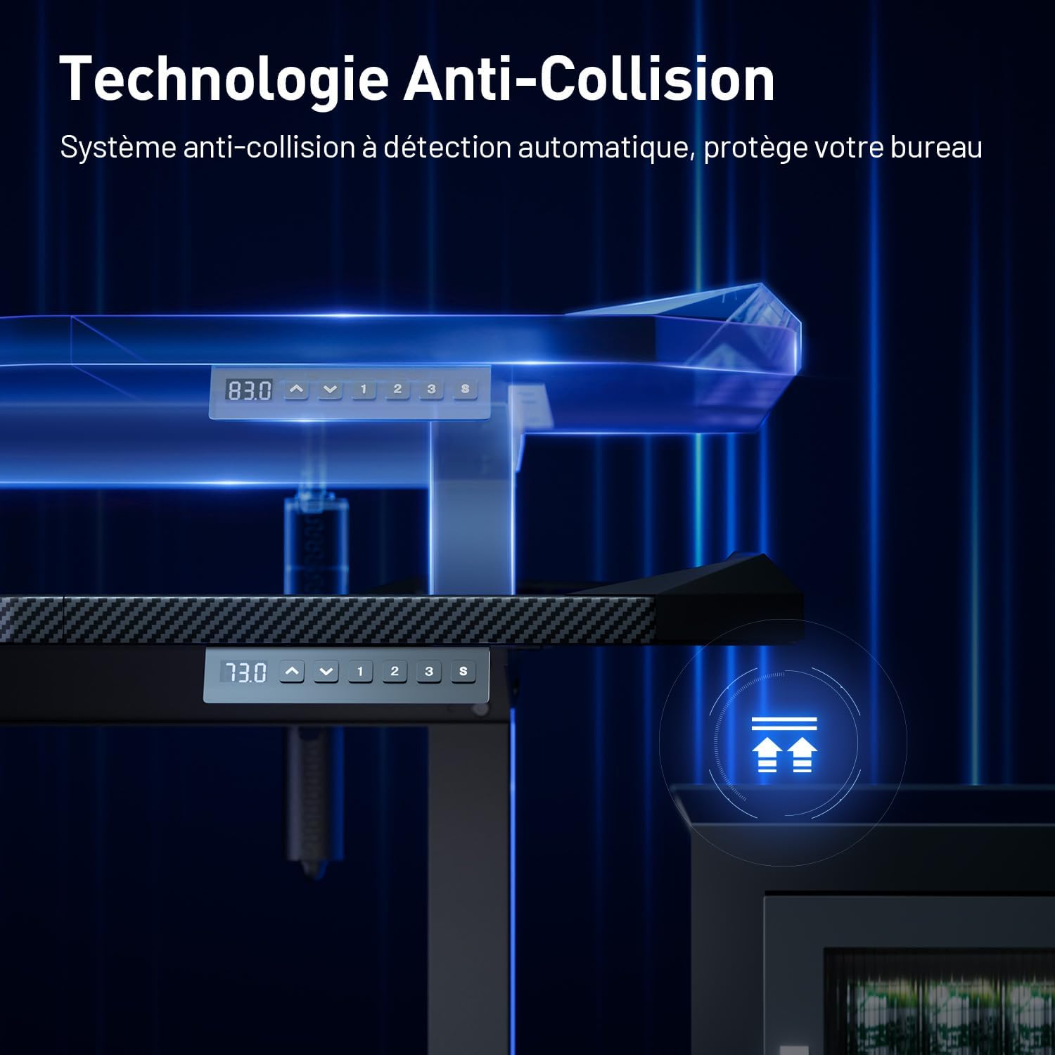 Super bureau assis-debout HLFURNIEU : montage rapide, montée et descente douces et silencieuses, surface en fibre de carbone élégante et assez grande pour écran et accessoires. Les trois mémoires sont pratiques, la table reste stable à toutes les hauteurs et le design noir est parfait pour le gaming comme pour le télétravail.