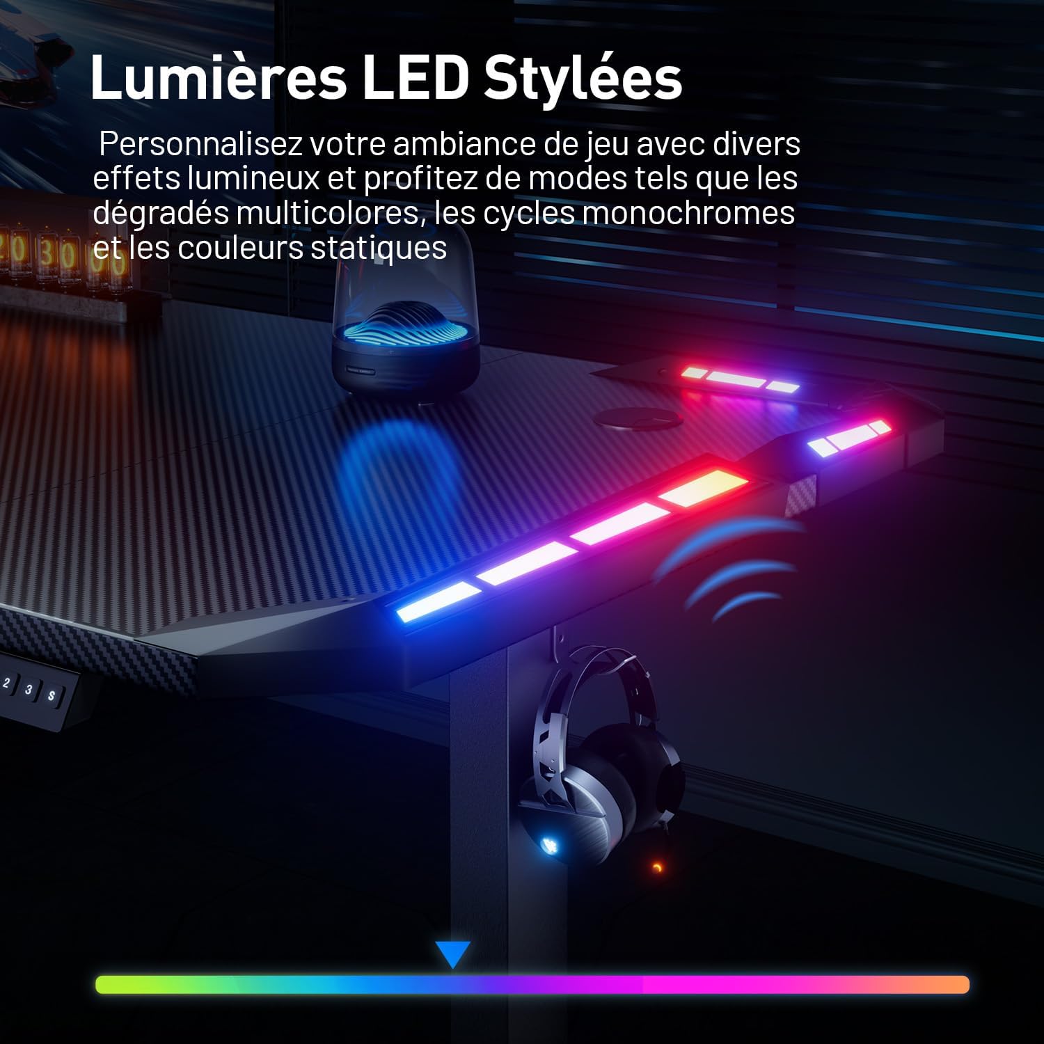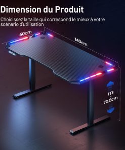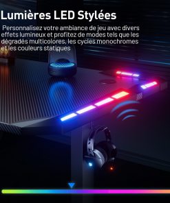 - 【Bureau Gaming avec Eclairage LED】 Cette bureau assis debout est ingénieusement conçue avec des lumières LED colorées et réglables sur les côtés gauche et droit, donnant au bureau un effet visuel plus technologique, avec une variété de modes d’éclairage et d’options de couleur. Vous pouvez facilement changer les effets lumineux à l’aide d’une télécommande, que ce soit pour créer une ambiance immersive et dynamique pour le gaming ou une atmosphère chaleureuse et détendue. Profitez d’une expérience de jeu totalement immersive !