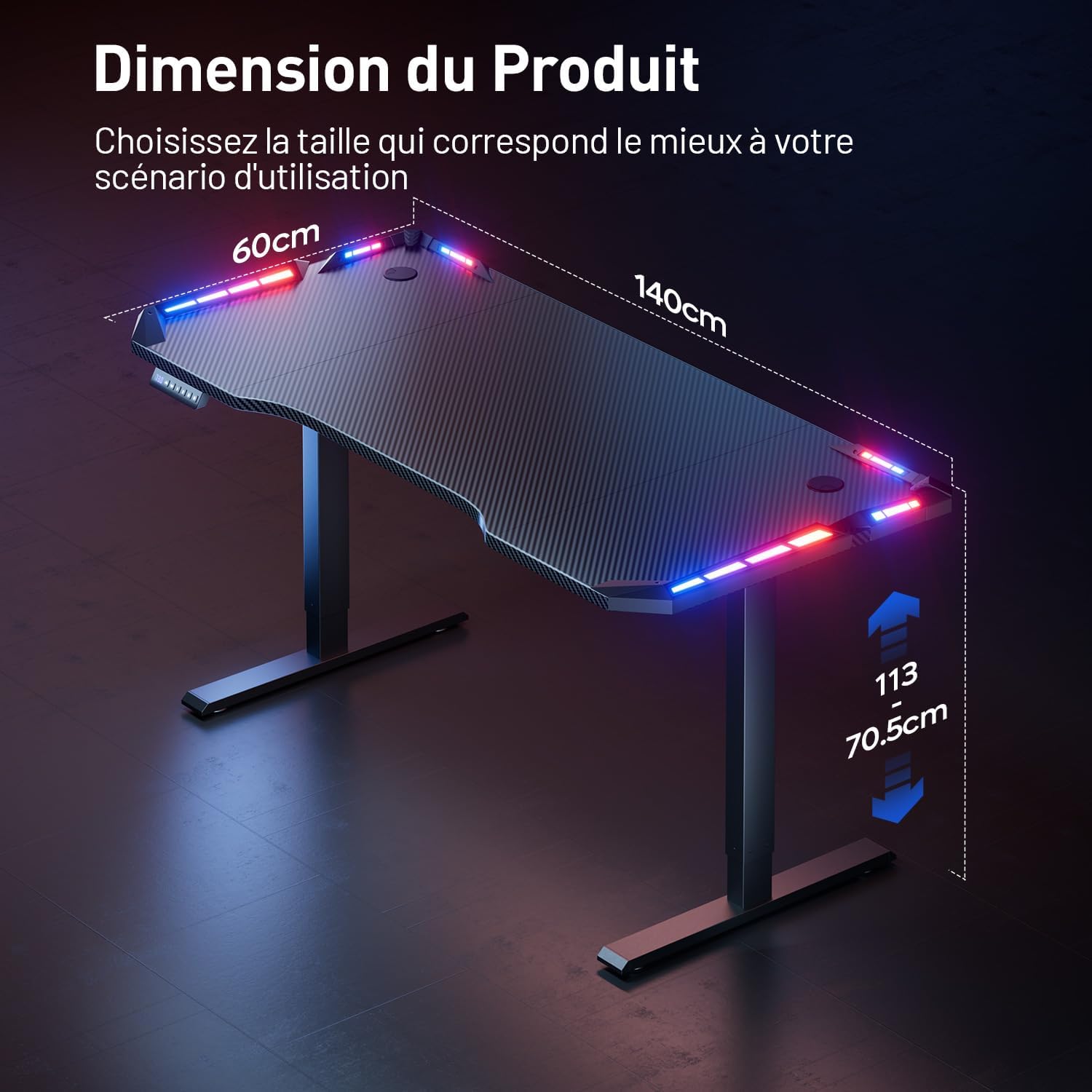- 【Bureau Gamer Spacieux】 Ce standing desk est conçu avec un large plateau de 140 × 60 cm, vous permettant de dépasser les contraintes d’espace et de profiter d’une expérience de jeu ultime. L’espace sous le bureau offre une liberté optimale pour vos jambes, que ce soit pour de longues sessions de jeu ou une utilisation quotidienne, vous ne ressentirez plus aucune gêne due à un espace restreint. Le plateau est revêtu d’une finition en fibre de carbone de haute qualité, offrant une excellente résistance aux rayures et à l’usure, protégeant ainsi votre bureau des dommages du quotidien et améliorant votre expérience de jeu.