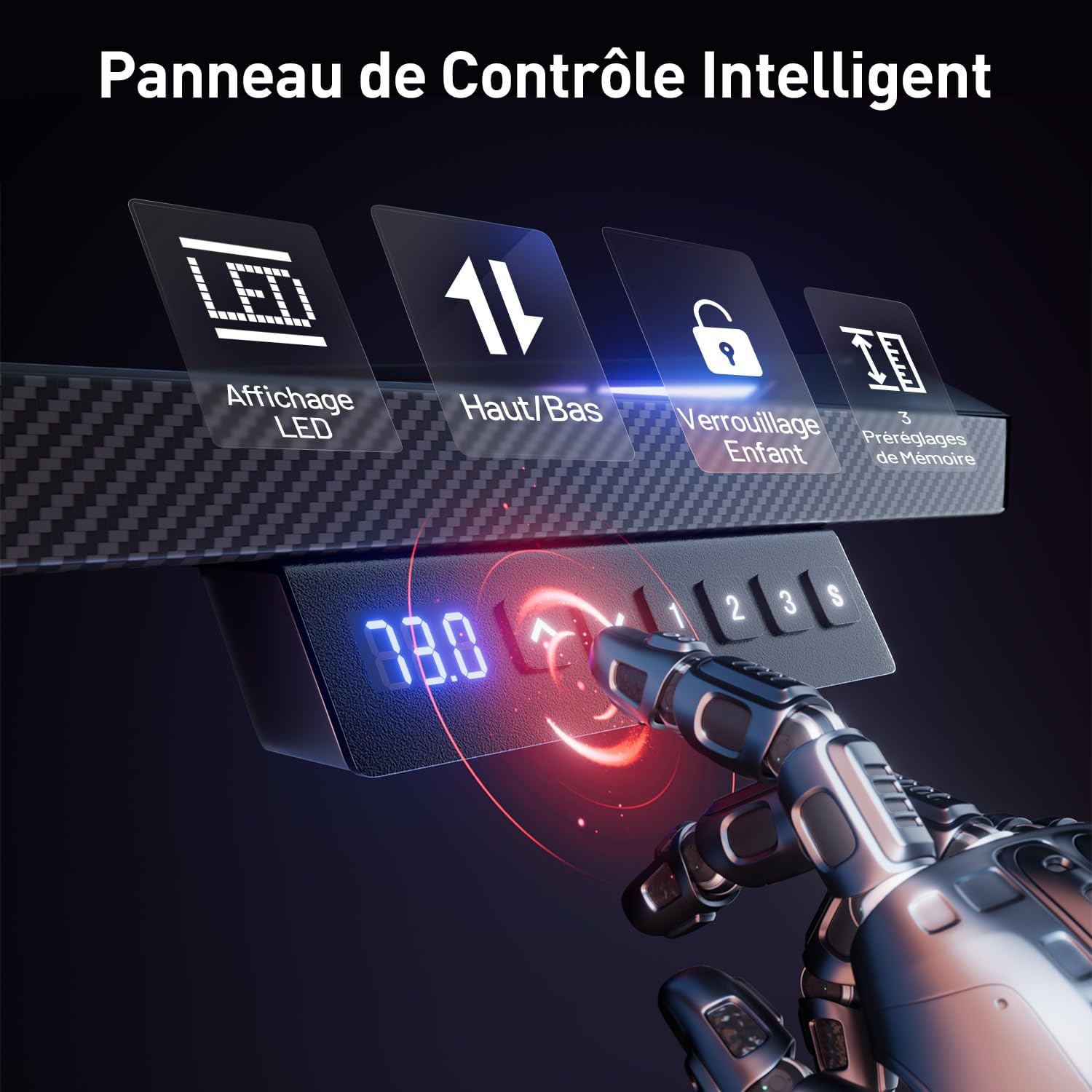 Ce bureau assis-debout HLFURNIEU est vraiment pratique pour les longues sessions de jeu et de travail : la montée/descente est silencieuse, les trois mémoires permettent de retrouver rapidement la hauteur idéale et la surface effet fibre de carbone est robuste et facile à nettoyer. Le montage est simple et la table est très stable une fois installée, le design noir reste sobre et classe — je recommande sans hésiter.