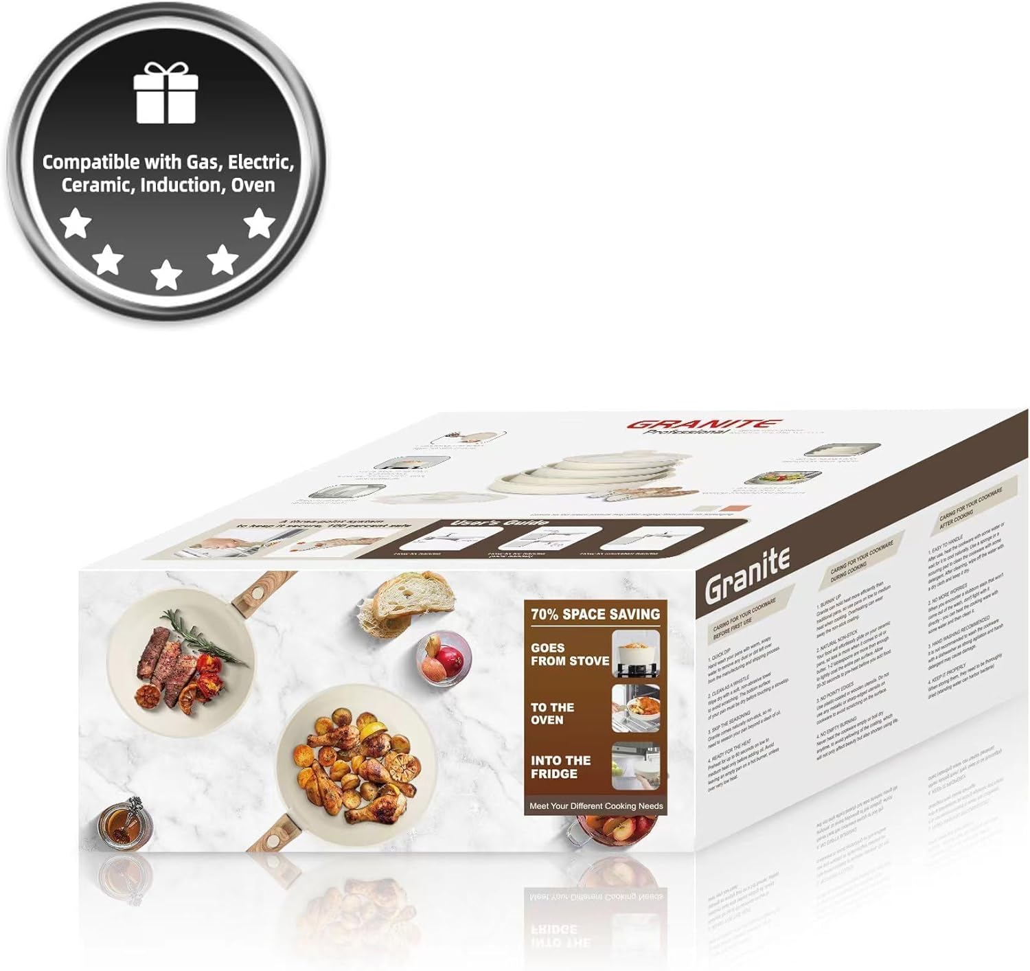 Ensemble de cuisson pratique et bien pensé pour une petite cuisine : les poignées détachables facilitent le rangement et les casseroles s’empilent proprement pour gagner de la place. Le revêtement antiadhésif style granit permet de cuisiner sans que les aliments n’attachent, les couvercles s’adaptent correctement et la compatibilité induction est un plus. Facile à nettoyer et solide au quotidien, bon rapport qualité-prix.