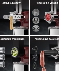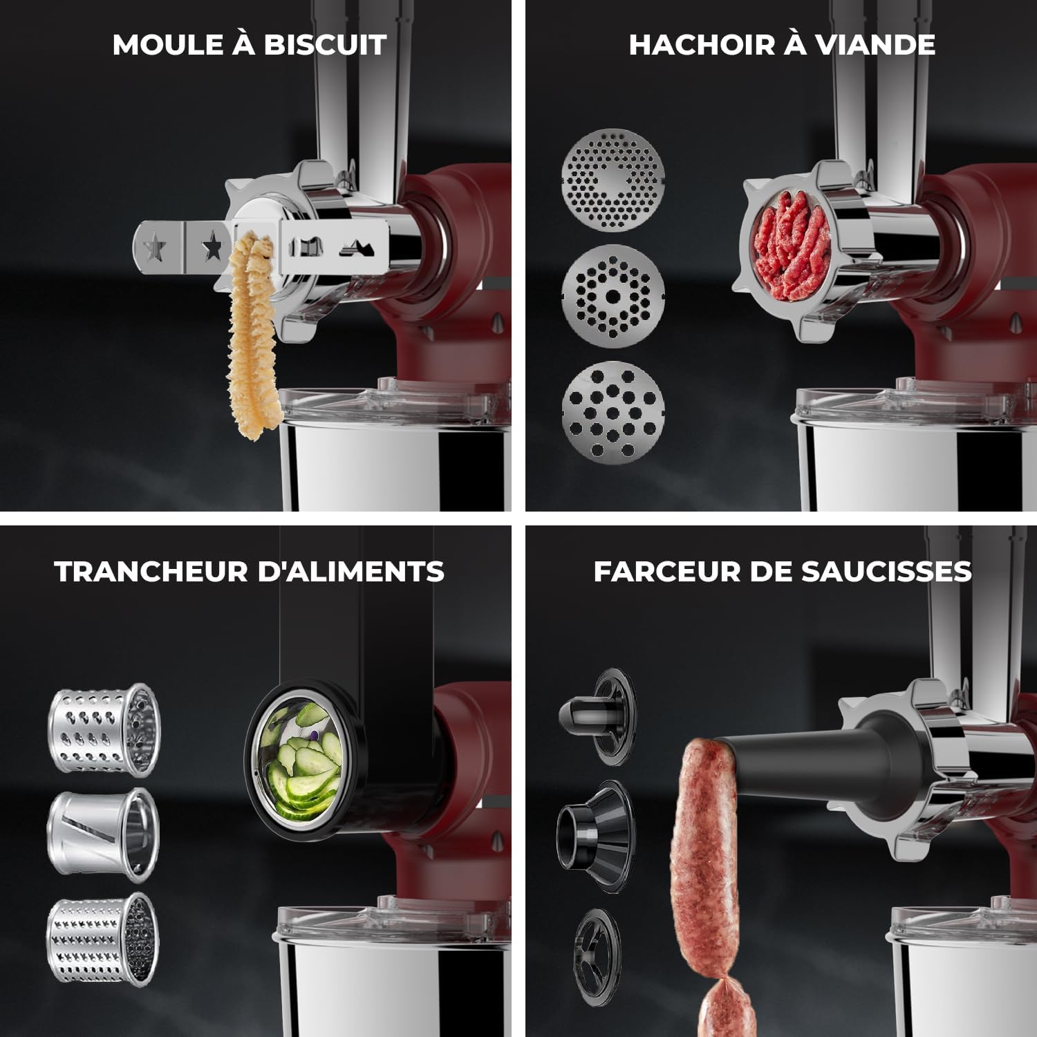 - 𝗨𝗧𝗜𝗟𝗜𝗦𝗔𝗧𝗜𝗢𝗡 𝗩𝗘𝗥𝗦𝗔𝗧𝗜𝗟𝗘 : En plus de mixer et de mélanger, le robot offre bien plus de possibilités. Utilisez le cutter avec ses 3 accessoires pour couper et râper légumes et fruits, préparez vos propres saucisses avec l’accessoire pour saucisses, et créez des biscuits de différentes formes avec l’appareil à biscuits. Le hachoir à viande dispose de 3 niveaux de mouture pour la préparation de viande hachée. Idéal pour tous les amateurs de cuisine!