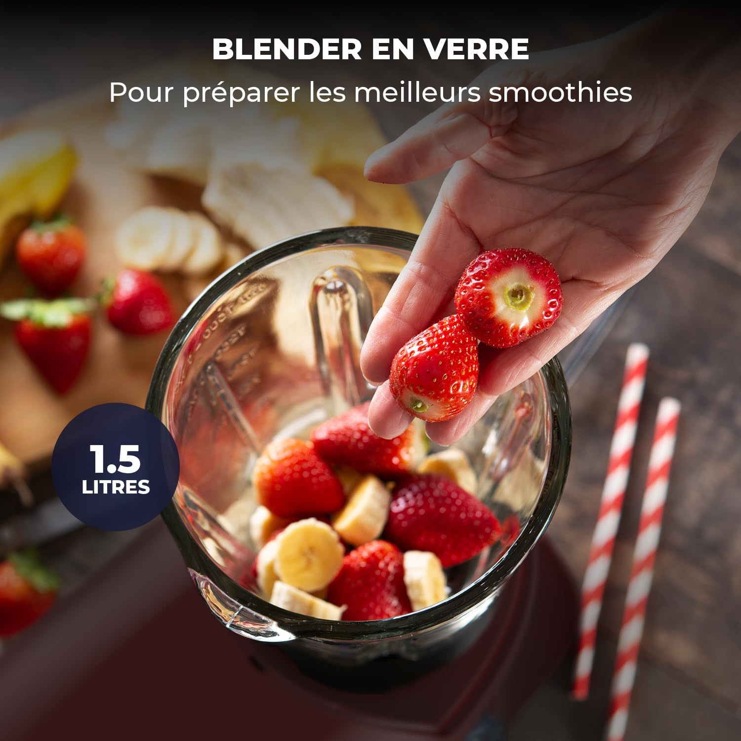 - 𝗠𝗜𝗫𝗘𝗨𝗥 𝗘𝗡 𝗩𝗘𝗥𝗥𝗘 𝗗𝗘 𝟭,𝟱𝗟 : Avec une capacité de 1,5 litre, vous pouvez rapidement mixer et préparer des smoothies, sauces et soupes grâce aux lames en acier inoxydable. Parfait pour préparer des recettes saines et savoureuses. Grâce au moteur puissant de 2000W, même broyer des glaçons devient un jeu d’enfant.