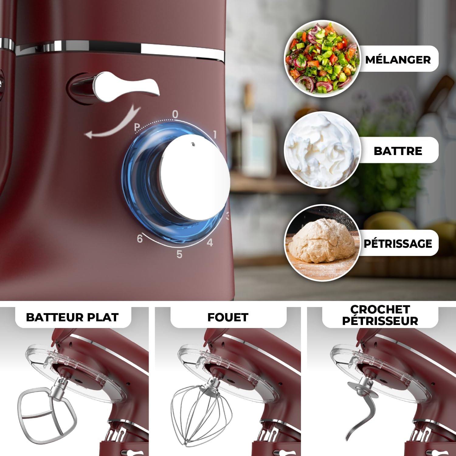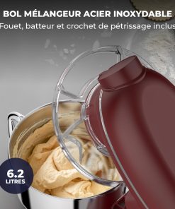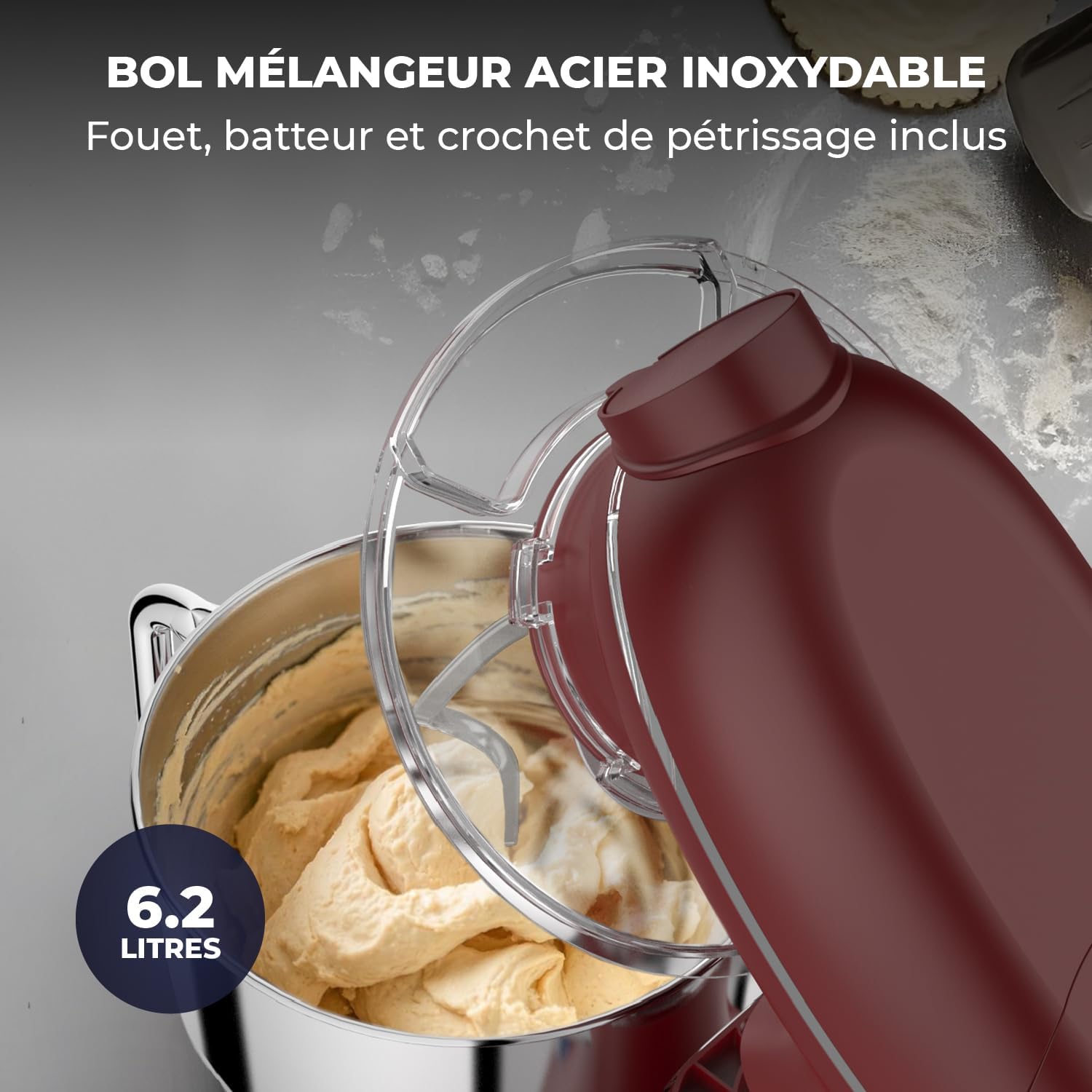 - 𝗕𝗢𝗟 𝗠É𝗟𝗔𝗡𝗚𝗘𝗨𝗥 𝗗𝗘 𝟲,𝟮𝗟 𝗘𝗡 𝗔𝗖𝗜𝗘𝗥 𝗜𝗡𝗢𝗫𝗬𝗗𝗔𝗕𝗟𝗘 𝗔𝗩𝗘𝗖 𝟯 𝗔𝗖𝗖𝗘𝗦𝗦𝗢𝗜𝗥𝗘𝗦 : Le robot est doté d’un bol mélangeur spacieux de 6,2 litres en acier inoxydable et est fourni avec un fouet, un crochet pétrisseur et un batteur plat. Un couvercle anti-projection est fixé au-dessus du bol, avec une ouverture de remplissage pour que vous puissiez ajouter des ingrédients pendant que le robot est en marche. Cela évite les éclaboussures et permet de garder la cuisine, vous-même et l’appareil propres.