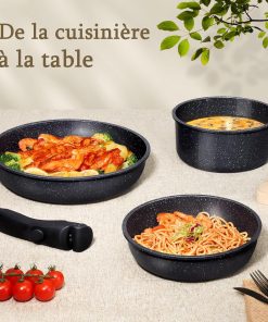 Ensemble pratique et bien conçu, les casseroles chauffent de façon homogène et le revêtement céramique facilite le nettoyage; la poignée amovible est solide et optimise le rangement, la compatibilité induction et la résistance au four en font un bon choix pour une utilisation quotidienne sur tous types de cuisinières.