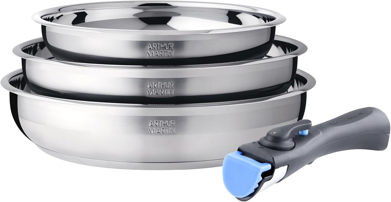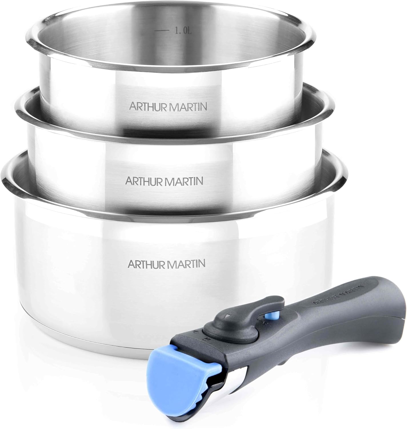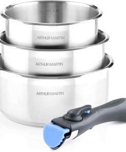 La batterie de cuisine Arthur Martin en inox est conçue pour répondre à tous vos besoins culinaires avec efficacité. Composée de trois casseroles de tailles variées (16, 18, 20 cm) et de deux manches amovibles, elle offre une flexibilité incomparable. L'acier inoxydable assure une répartition uniforme de la chaleur, évitant les points chauds et garantissant des résultats de cuisson optimaux. Compatible avec tous les types de feux, y compris l'induction, cet ensemble est idéal pour toutes les cuisines. La poignée amovible permet un rangement aisé et une manipulation sécurisée, libérant de l'espace dans vos placards. Les surfaces en inox et antiadhésives facilitent le nettoyage, que ce soit à la main ou au lave-vaisselle. Conçue pour le confort, cette batterie de cuisine allie praticité et esthétique, rendant chaque préparation culinaire agréable et sans effort.