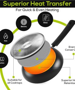- Répartition uniforme de la chaleur – Le fond à induction de la poêle convient à tous les types de plaques de cuisson, y compris électriques et vitrocéramiques.