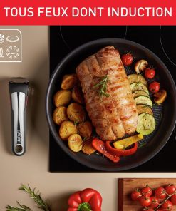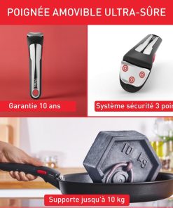 Description du produit Vous voulez vous simplifier la vie en cuisine ? Ingenio est là pour vous aider ! Grâce à sa poignée amovible, vous pourrez cuire sur la plaque de cuisson, gratiner vos recettes au four et conserver les restes au frigo. Et en plus, gagnez de la place dans vos placards grâce à son empilabilité : Ingenio, c’est bien plus qu’une poêle ! Une cuisson intensive exige une poêle capable de résister à des conditions extrêmes. Dotée du tout nouveau revêtement TITANIUM ANTI-RAYURES, la poêle Ingenio Eco Resist On offre une durabilité antiadhésive exceptionnelle qui résiste même aux ustensiles en métal et élève la cuisine à un tout autre niveau. Avertissement De Sûreté Se référer au mode d’emploi du produit ou à son safety book