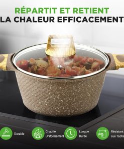 Très satisfait de cette batterie NutriChef 22 pièces : le revêtement antiadhésif tient vraiment bien, compatible induction, les poignées sont confortables et les ustensiles résistent bien à la chaleur. Le marbre marron est élégant et tout se nettoie facilement. Bon rapport qualité-prix, je la recommande pour un usage quotidien.