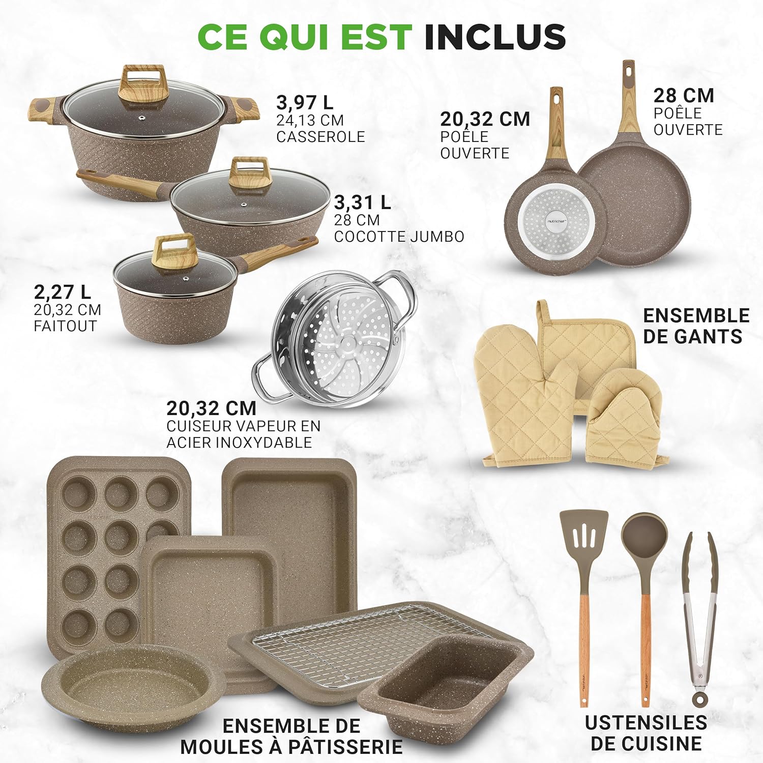 Très satisfaite de cet ensemble 22 pièces NutriChef : le revêtement antiadhésif est efficace, la finition marbre marron est élégante et s’accorde bien à la cuisine, et la compatibilité induction est un vrai plus. Les casseroles et poêles chauffent de façon homogène, les ustensiles résistent bien à la chaleur et tout se nettoie facilement. Bon rapport qualité-prix pour une collection complète et pratique au quotidien.