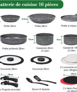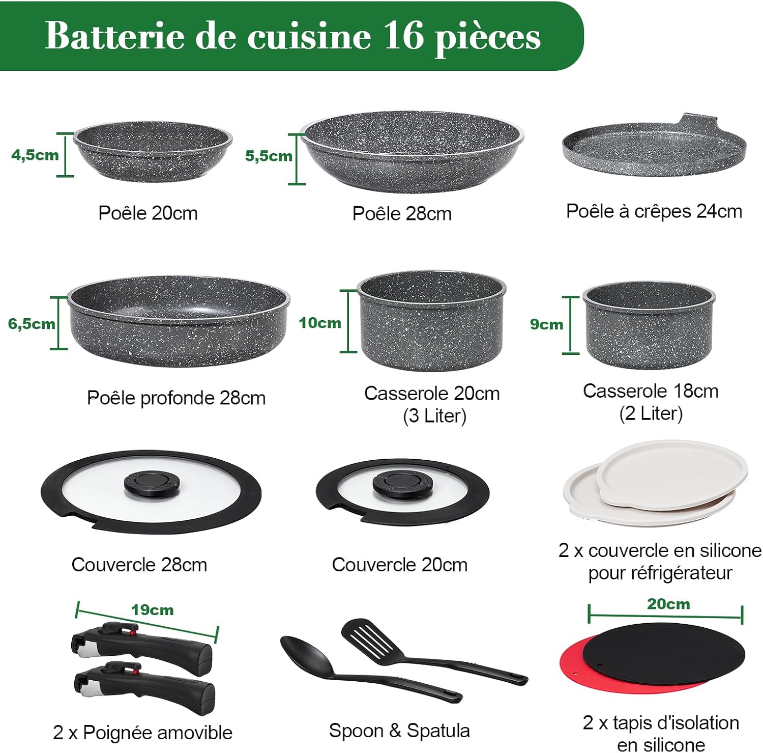 - Batterie de cuisine 16 pièces : 2 casseroles 18 cm / 20 cm, 2 poêles à frire 20 cm / 28 cm, 1 poêle haute 28 cm, 1 crêpière 24 cm, 2 couvercles en verre 20 cm / 28 cm, 2 couvercles en silicone 18 cm / 20 cm, 2 poignées amovibles, 2 dessous de plat en silicone 20 cm, 2 spatules