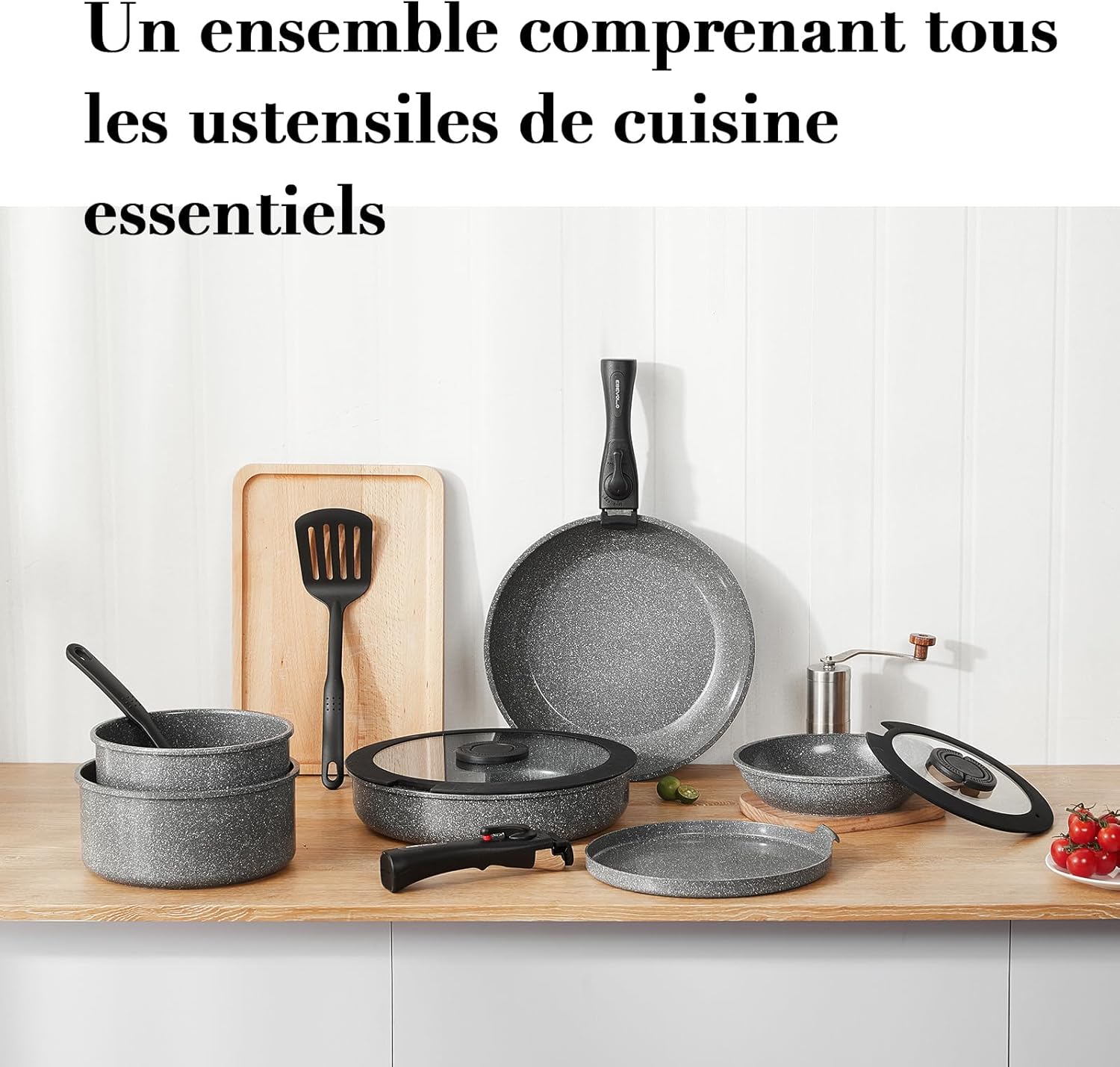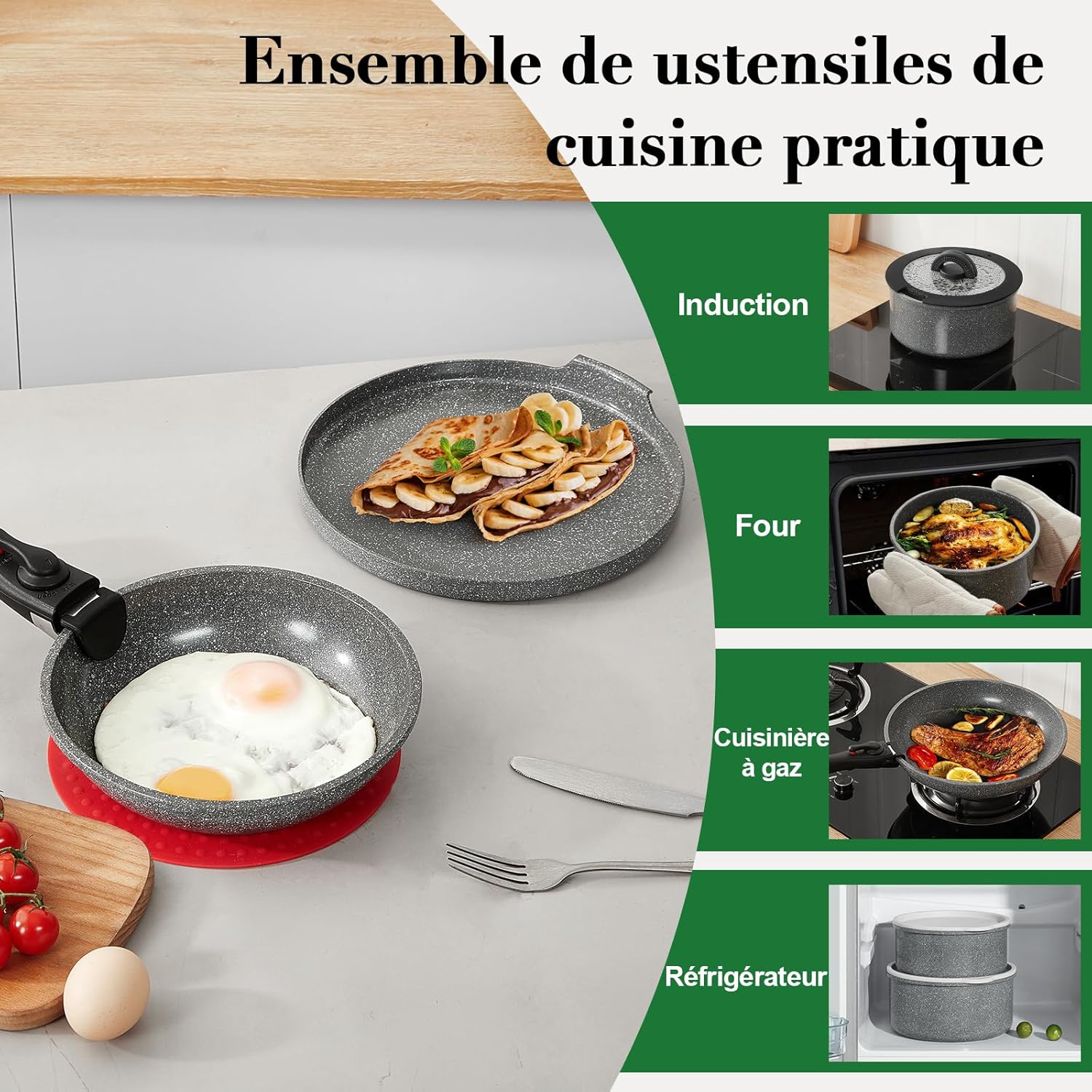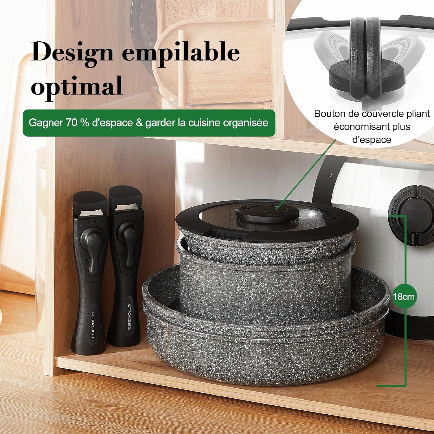 - Empilable et peu encombrant : Grâce aux poignées amovibles et au design empilable, cette batterie de cuisine économise jusqu'à 70 % d'espace de rangement. Elle est également légère et facile à transporter, parfaite pour la cuisine ou le camping