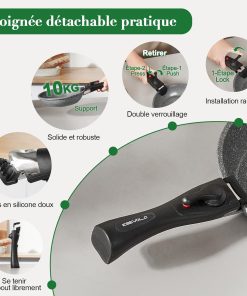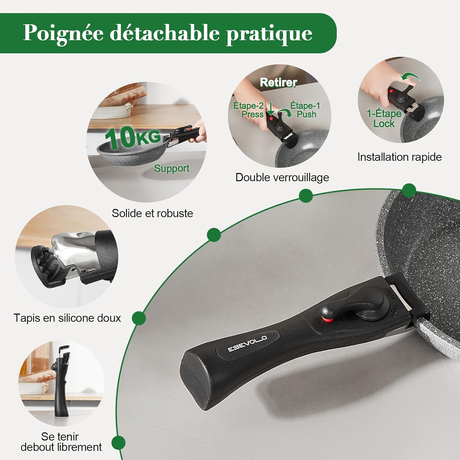 - Poignée amovible : La poignée ergonomique s'installe en quelques secondes, facilitant le transport de la batterie de cuisine de la cuisinière à la table, au réfrigérateur ou au four. Elle supporte jusqu'à 10 kg et a été testée professionnellement pour garantir une utilisation stable et sécurisée